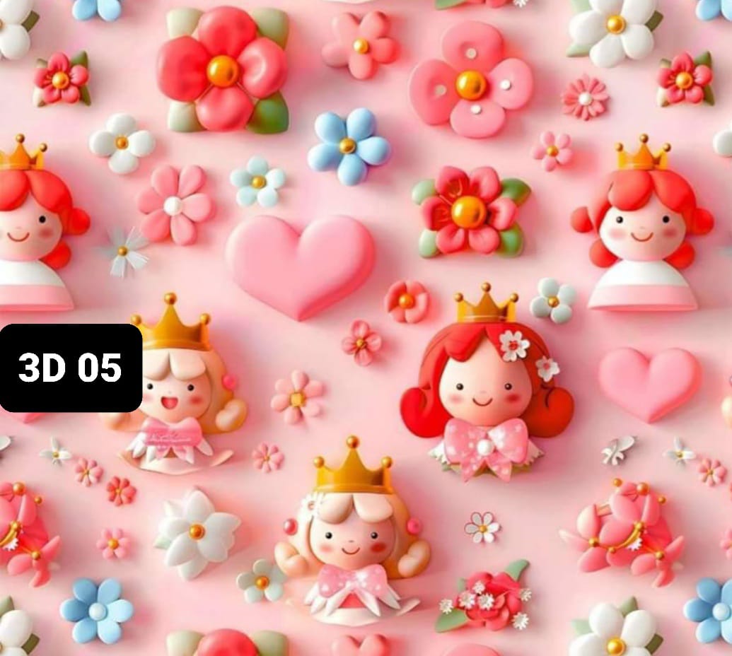Tricoline 100% algodão com princesas em 3D em fundo rosa.