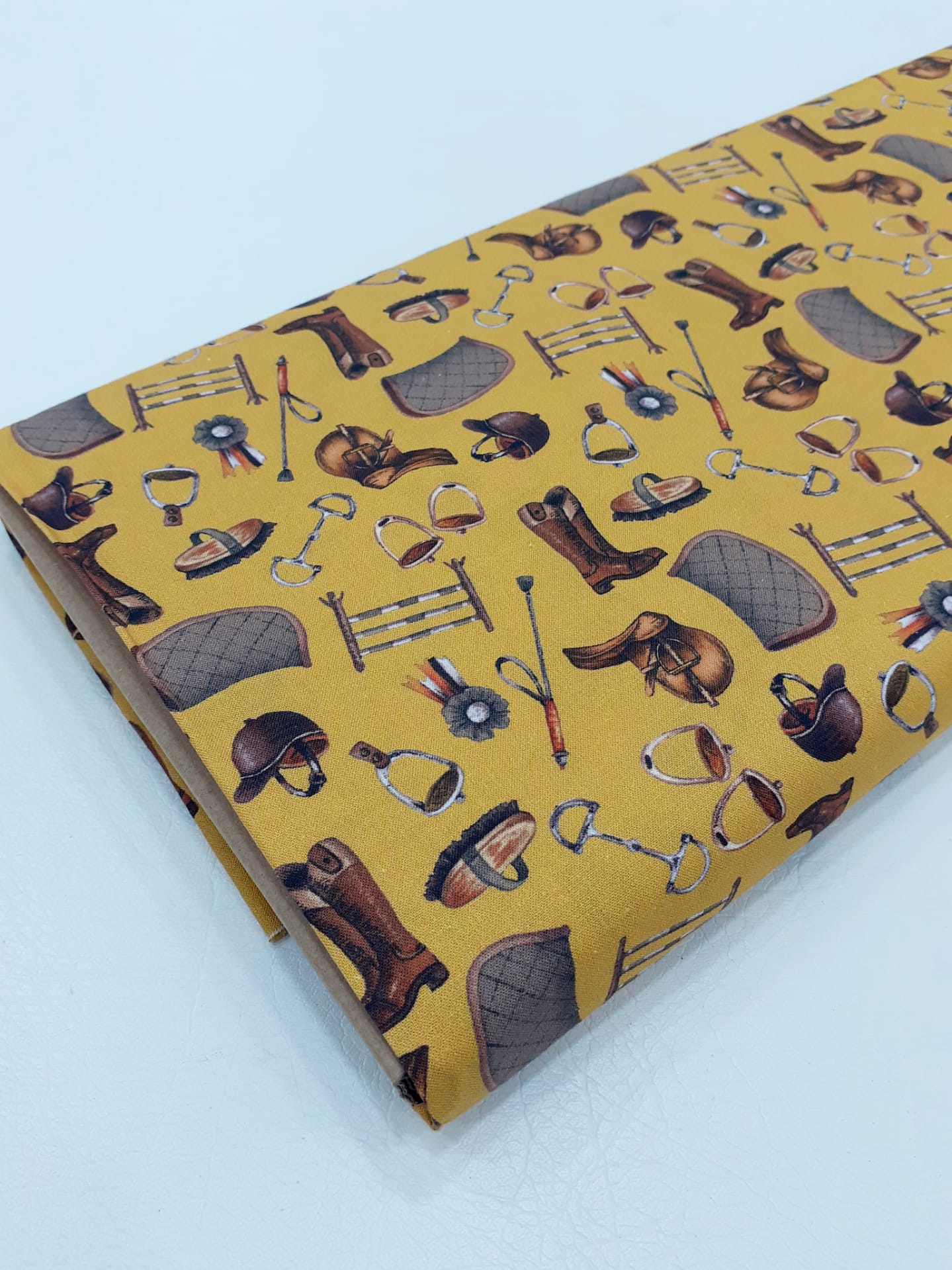 Tecido Stof Fabrics 100% algodão com acessórios de equitação em fundo amarelo torrado