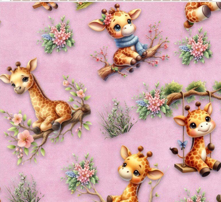 Tecido 100% Algodão , com girafas e flores em fundo rosa.
