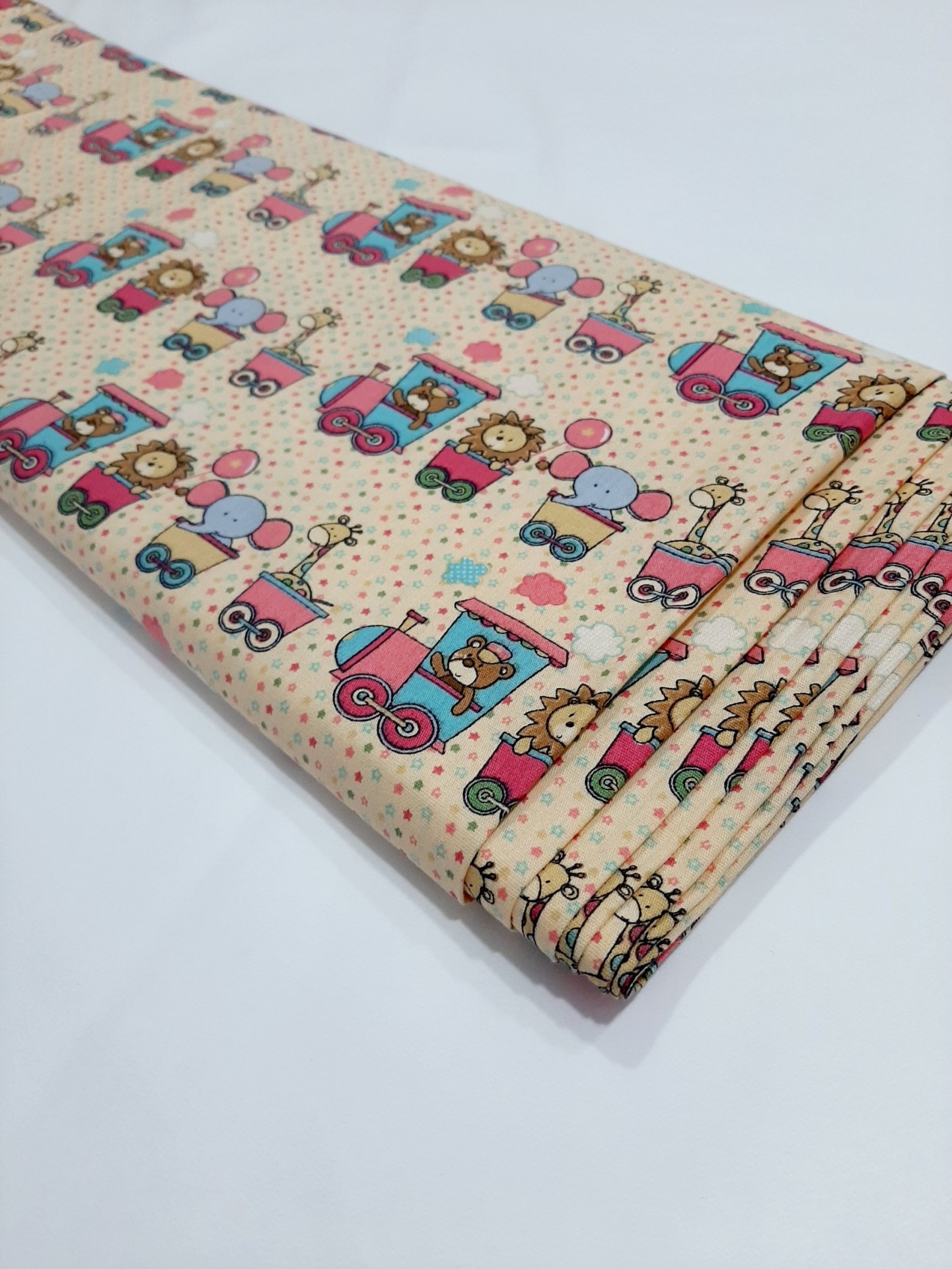 Animais no comboio 0,14 € Partilhar Adicionar Contactar 200 unidades em stock Tecido Fabricart 100% algodão, com animais no comboio e fundo amarelo claro. 1.50m de largo Corte mínimo 20cm Tags animaisBebéselva