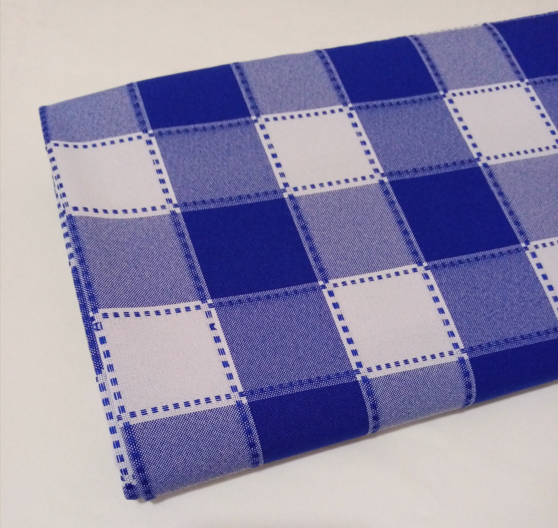Tecido 100% Poliester com quadrados brancos e azulão.