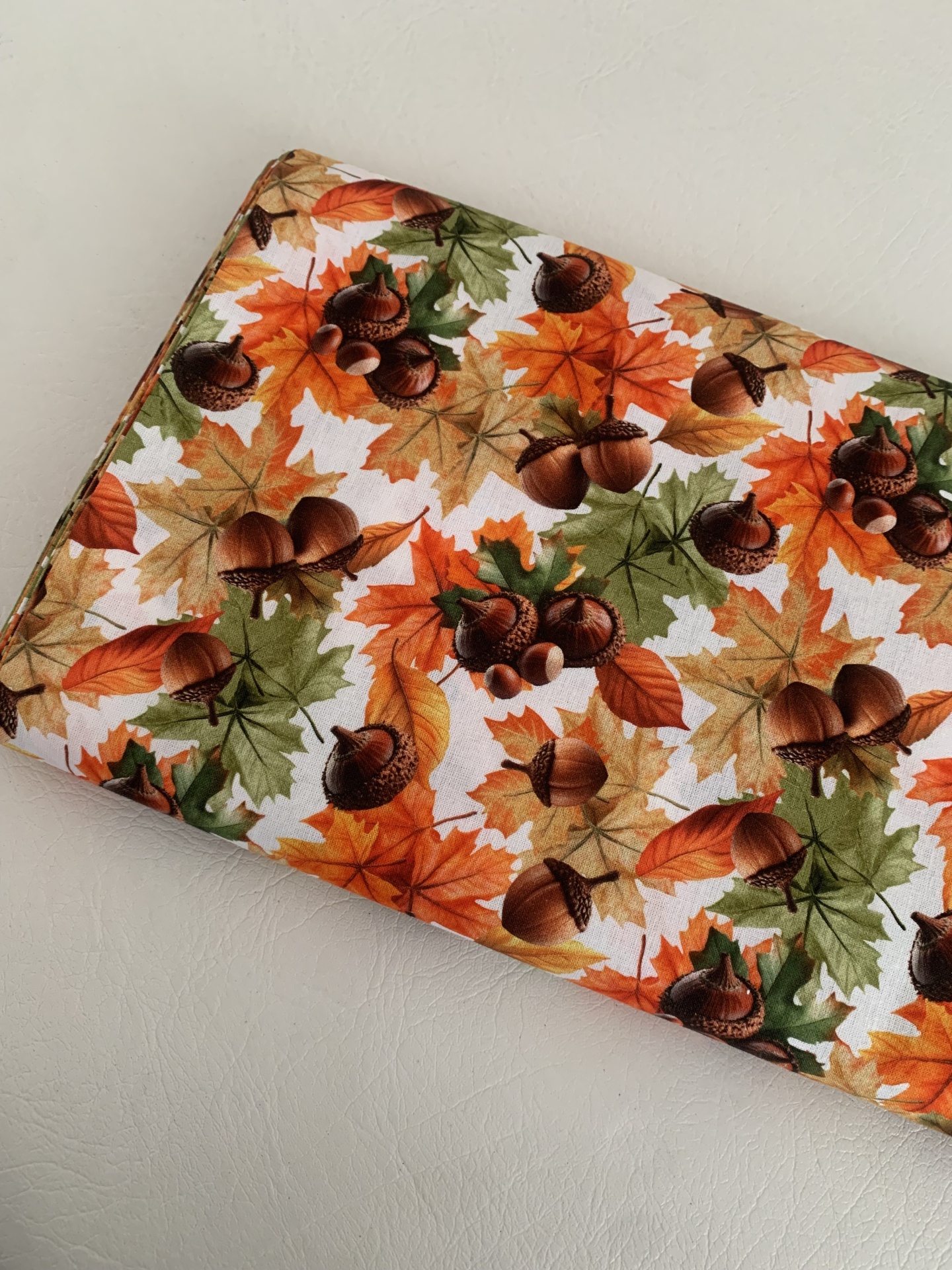 Tricoline 100% algodão, com avelãs em fundo branco.