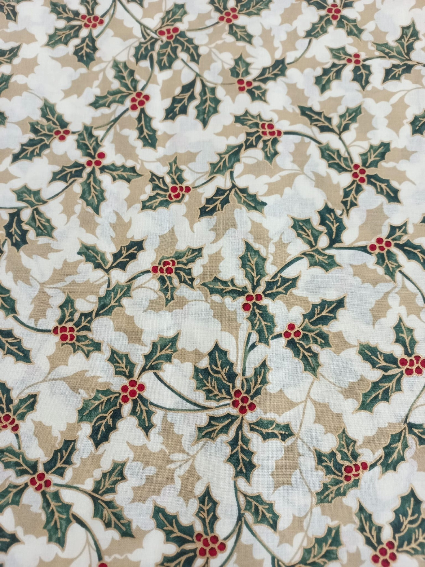 Popeline 100% algodão, com azevinho com fundo pérola.