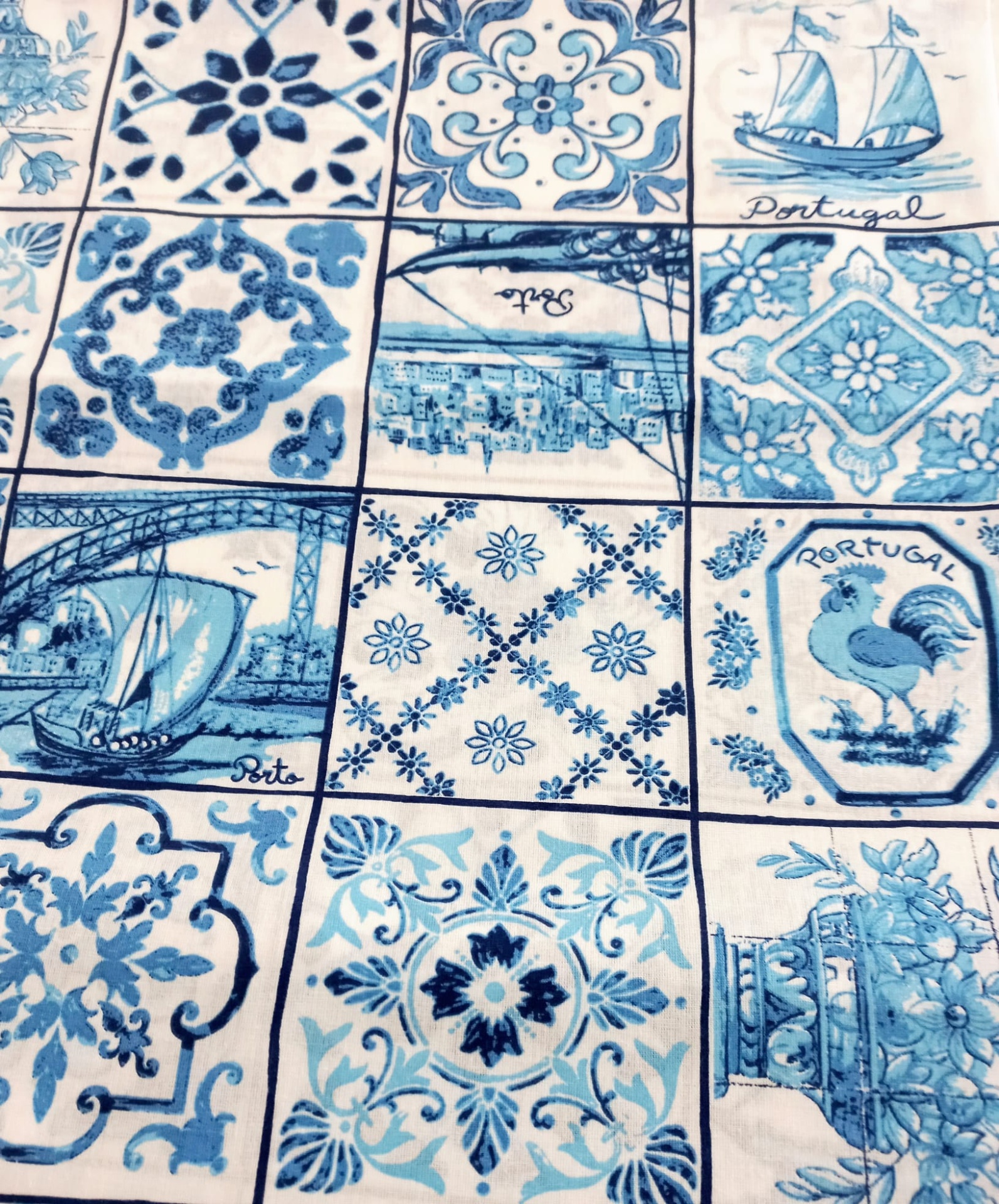 Tecido 50% algodão, 50%poliéster, com azulejos Portugueses em vários tons de azul e branco.