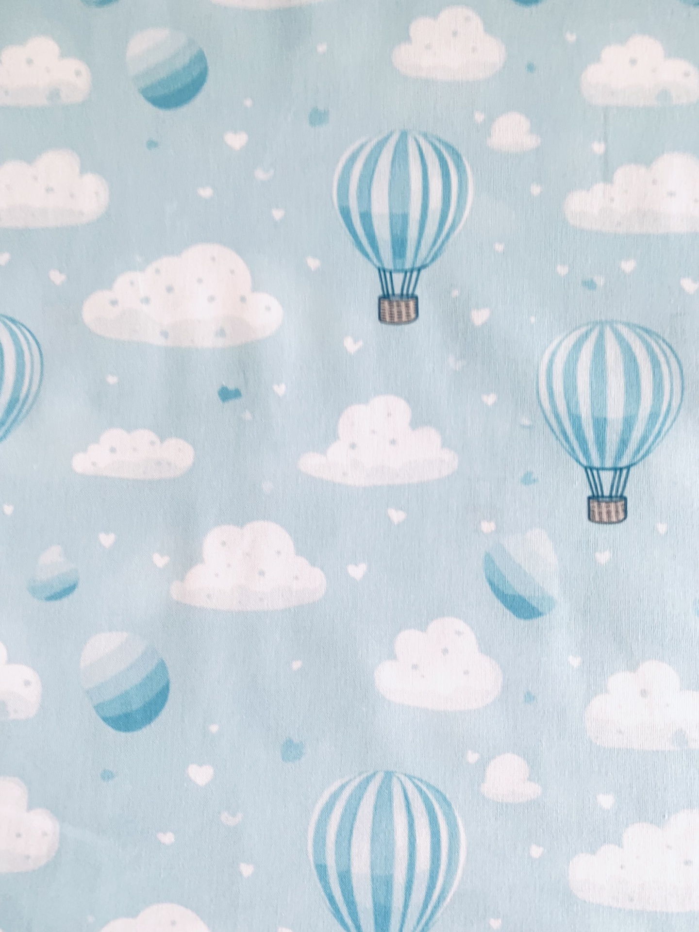 No Tricoline 100% algodão com balões e nuvens en fundo azul.