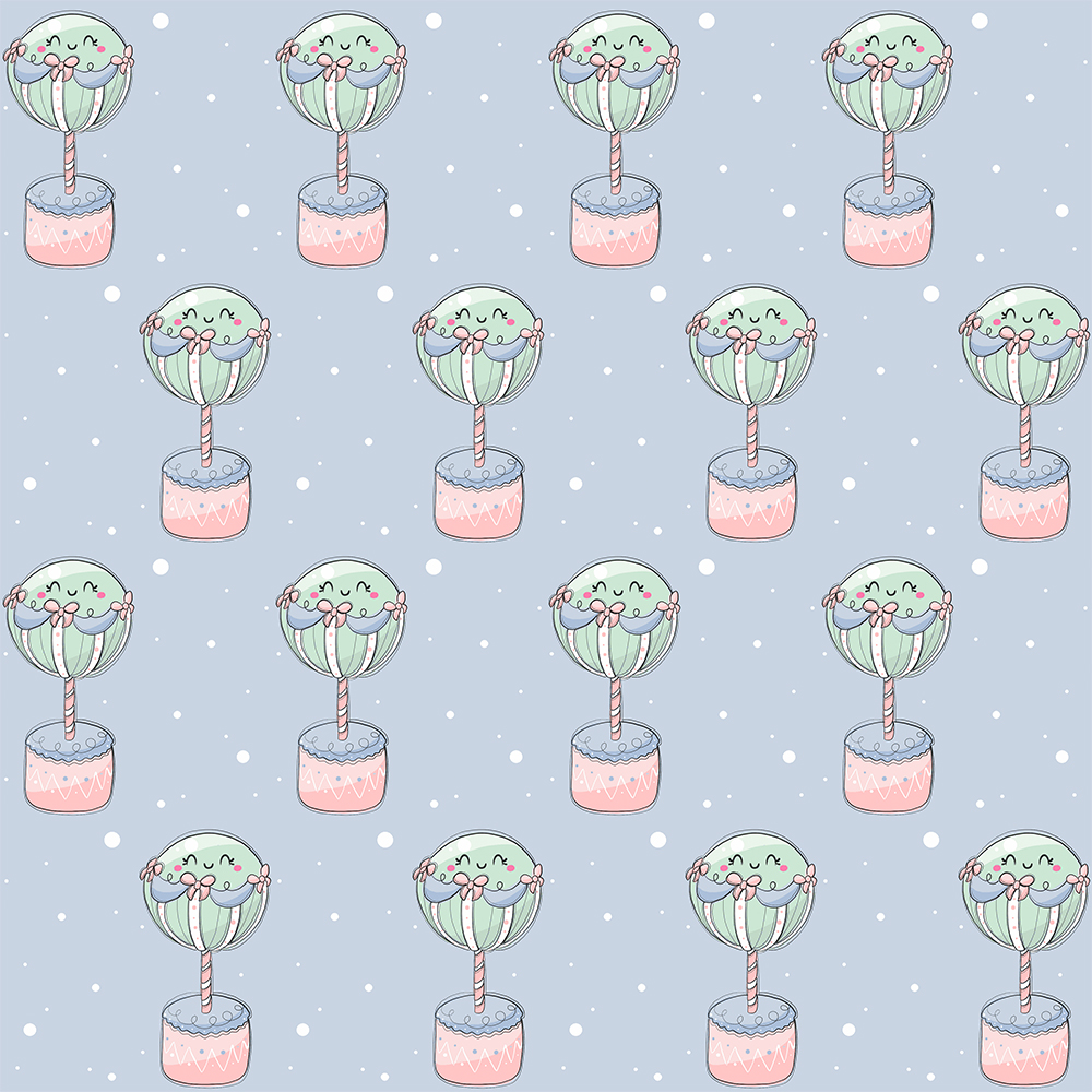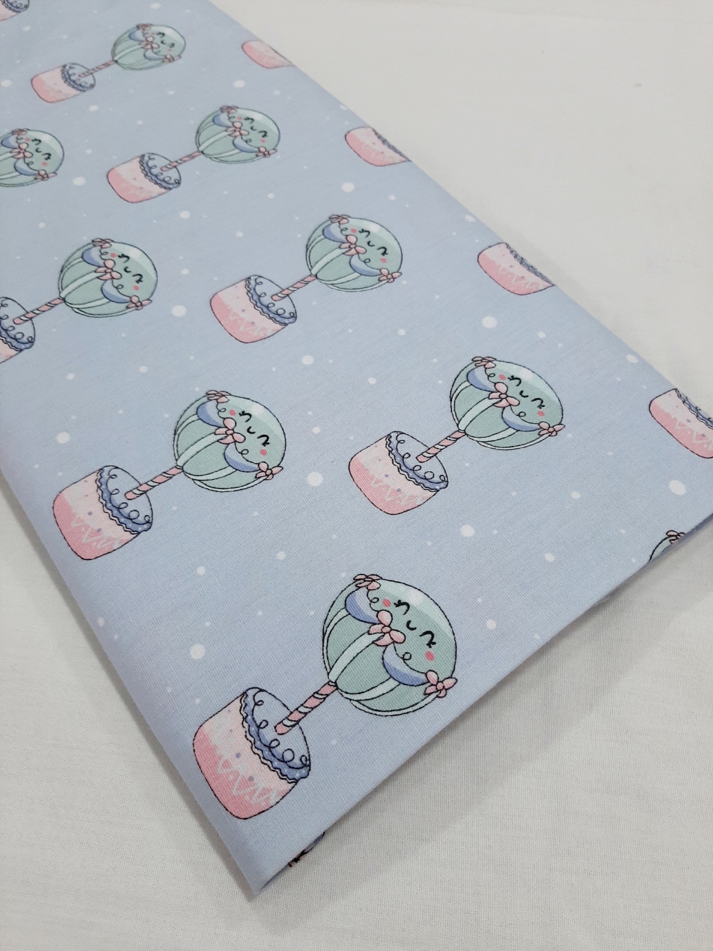 Tecido Fabricart 100% algodão, balões de ar quente em azul e rosa com fundo azul.