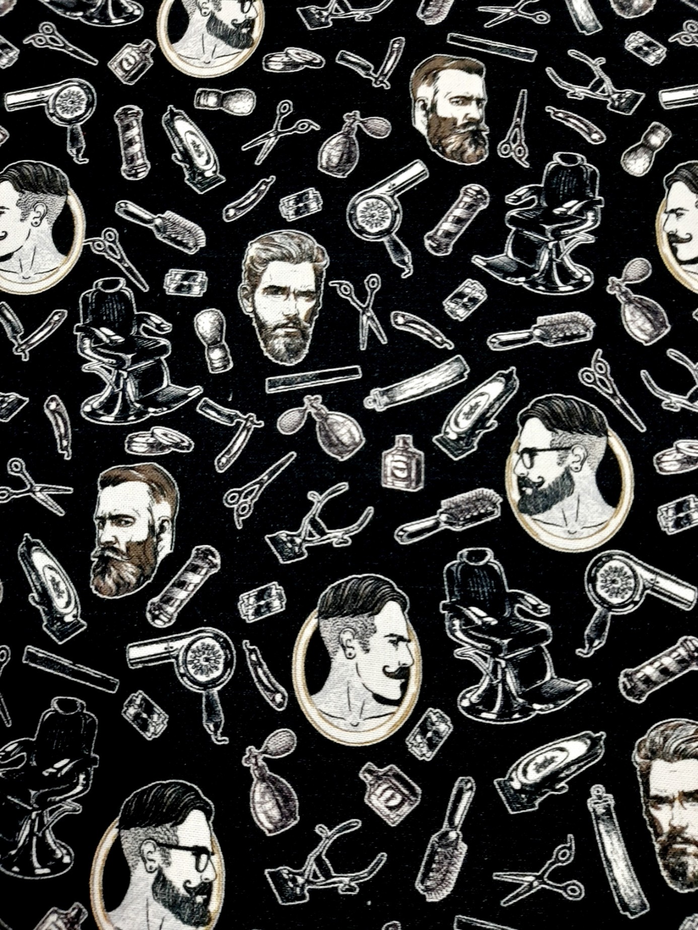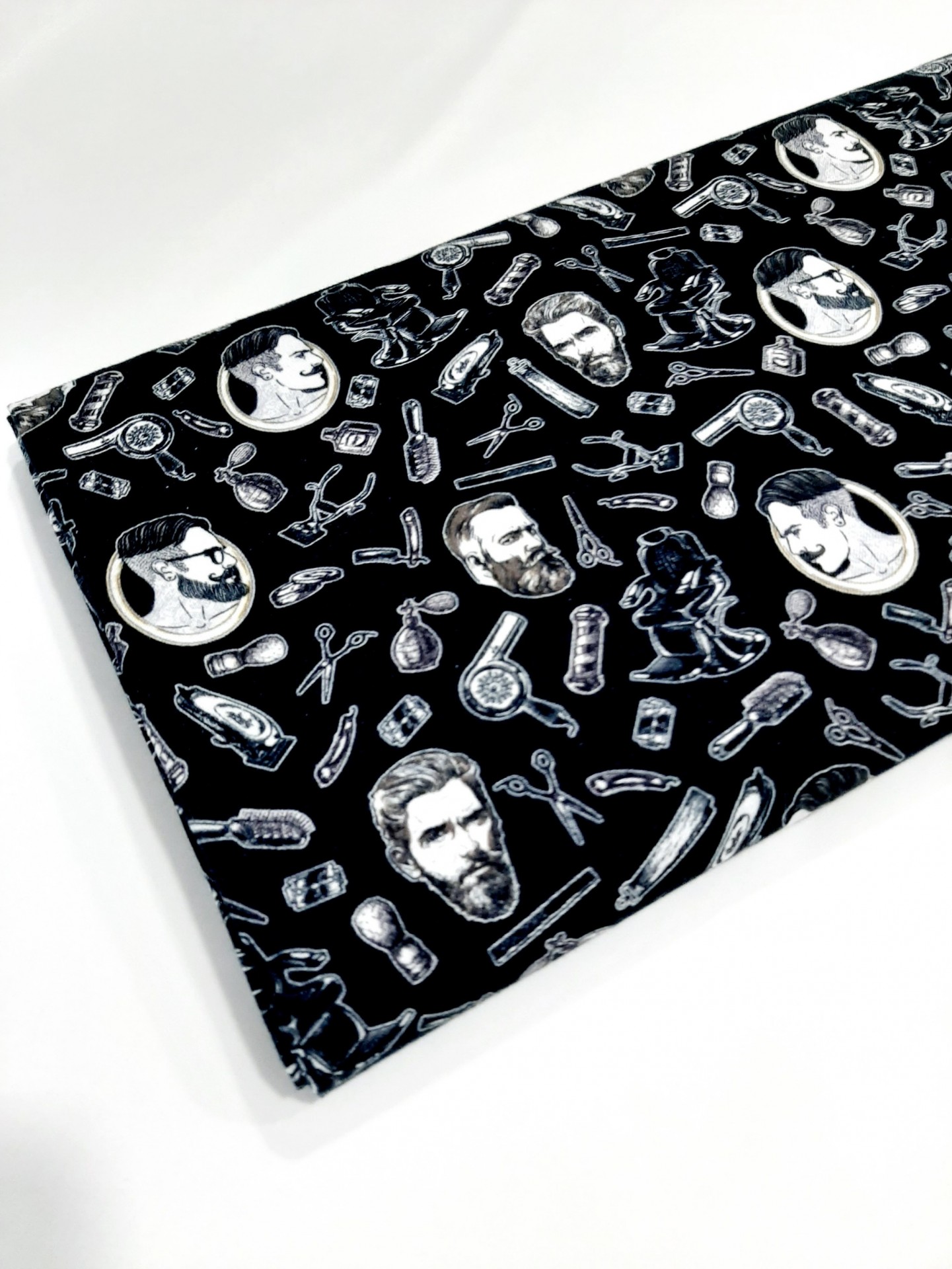 Tecido Indigo Fabrics 100% algodão, com motivos de barbearia em fundo preto.