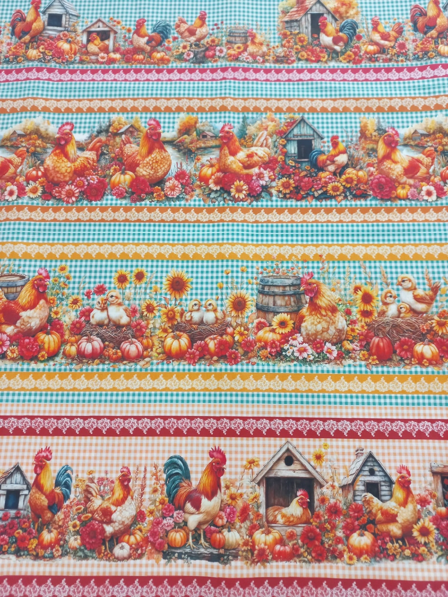 Tricoline 100% algodão com 10 barras todas diferentes com galos e galinhas.