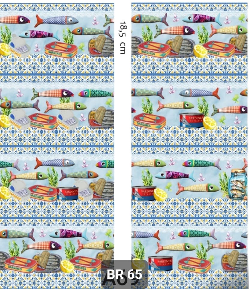 Tecido 100% algodão com 8 barras todas elas diferentes com sardinhas.