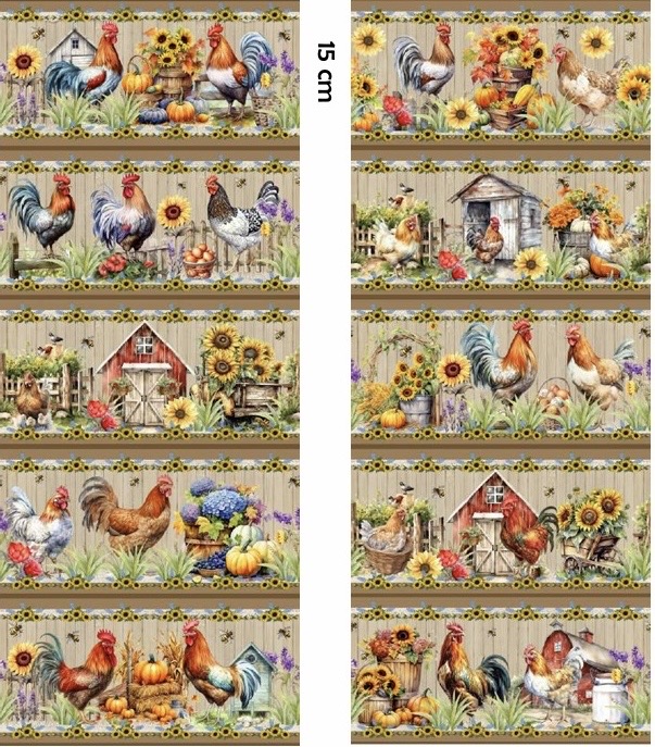 Tecido 100% algodão com 10 barras todas elas diferentes com galinhas.