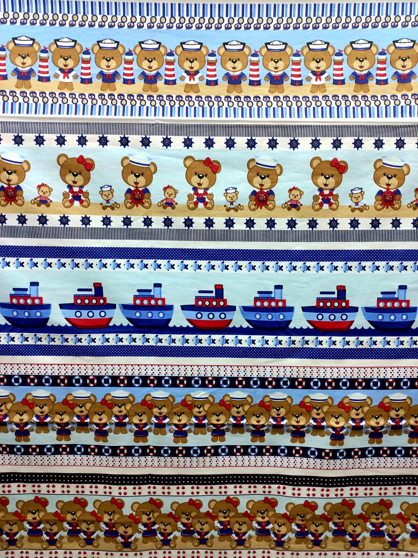 Tricoline Fabricart 100% algodão com barras de ursinhos marinheiros em fundo branco.