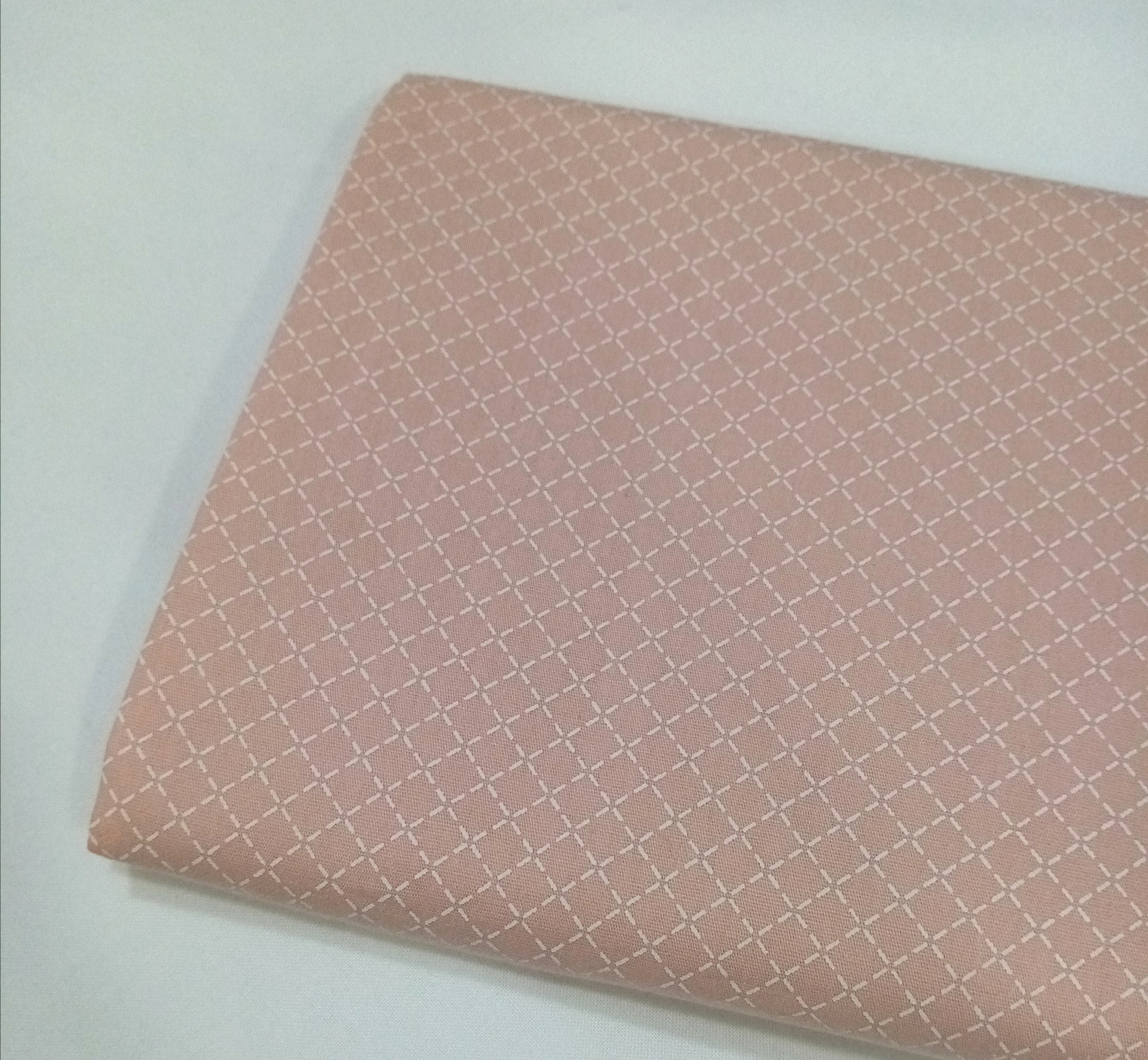 Tricoline Fuxicos e Fricotes 100% algodão em fundo rosa com pesponto em branco.