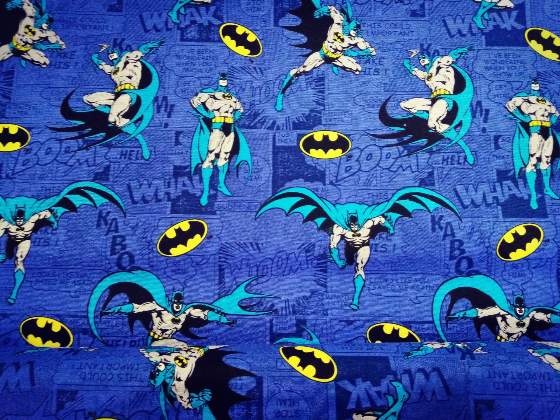 Batman em fundo azulão 0,14 € Partilhar Adicionar Contactar 95 unidades em stock Tecido 100% algodão, com o Batman em fundo Azulão. 1.10m de largo Corte mínimo 20cm