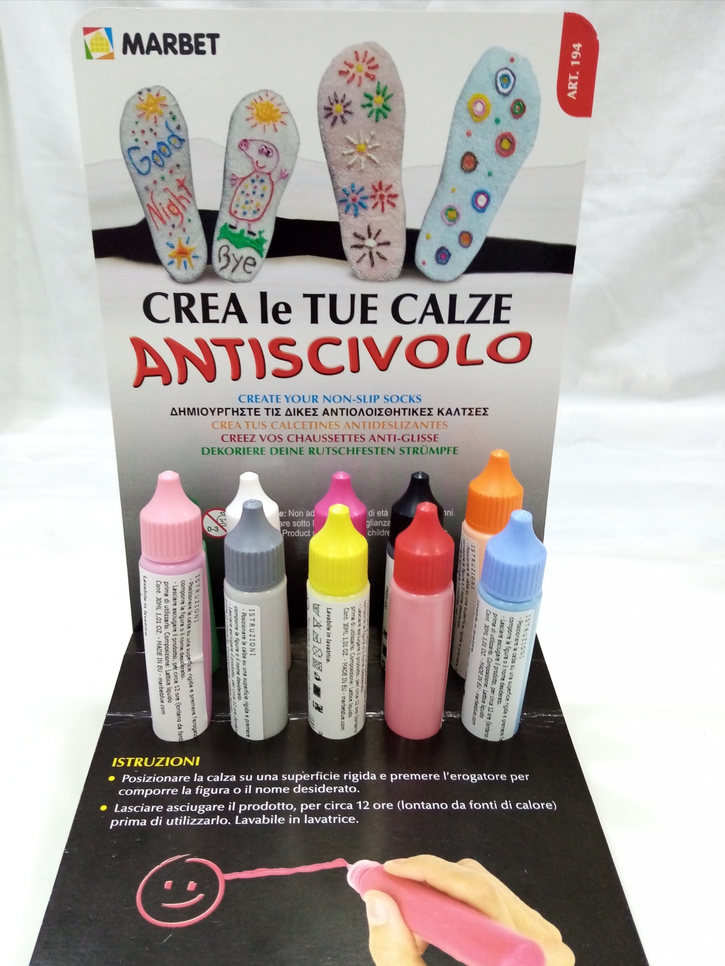 Instruções: Colocar a meia sobre uma superficie rigida e apertar a bisnaga para formar o desenho desejado.