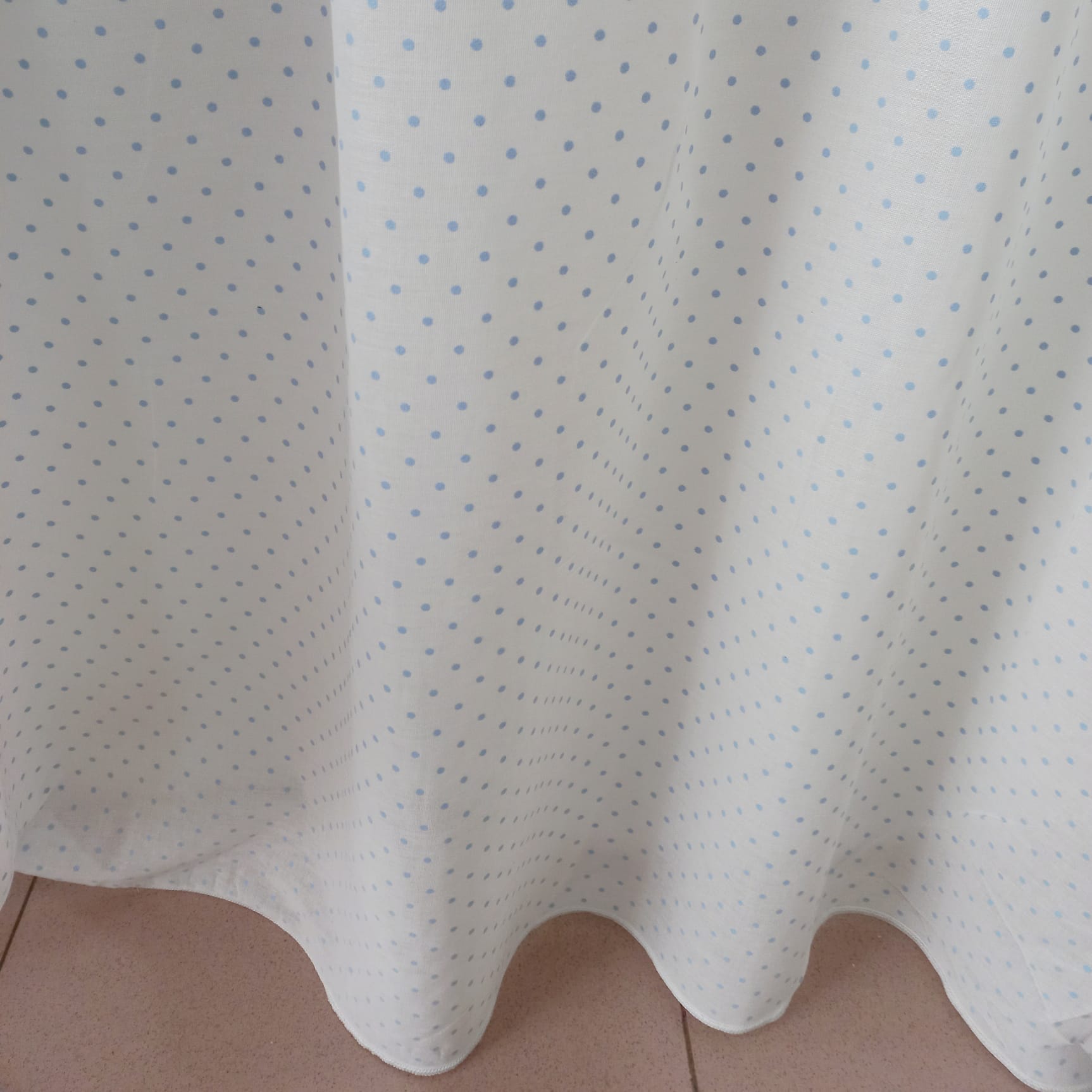 Tecido 100% Poliéster com bolinhas azuis em fundo branco.