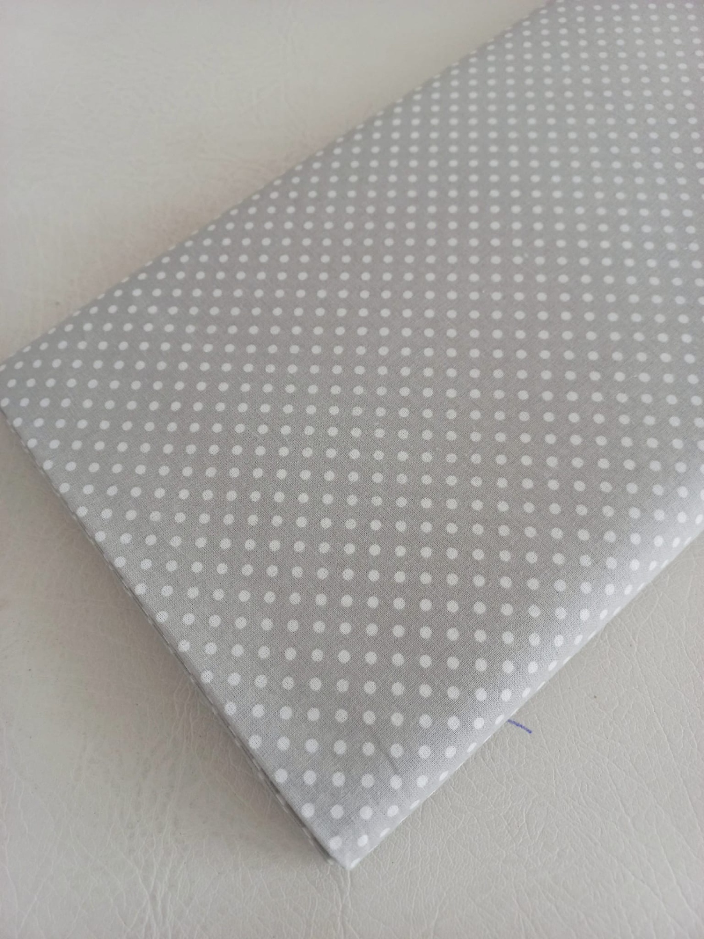 Popeline 100% algodão com bolinhas brancas em fundo cinza.