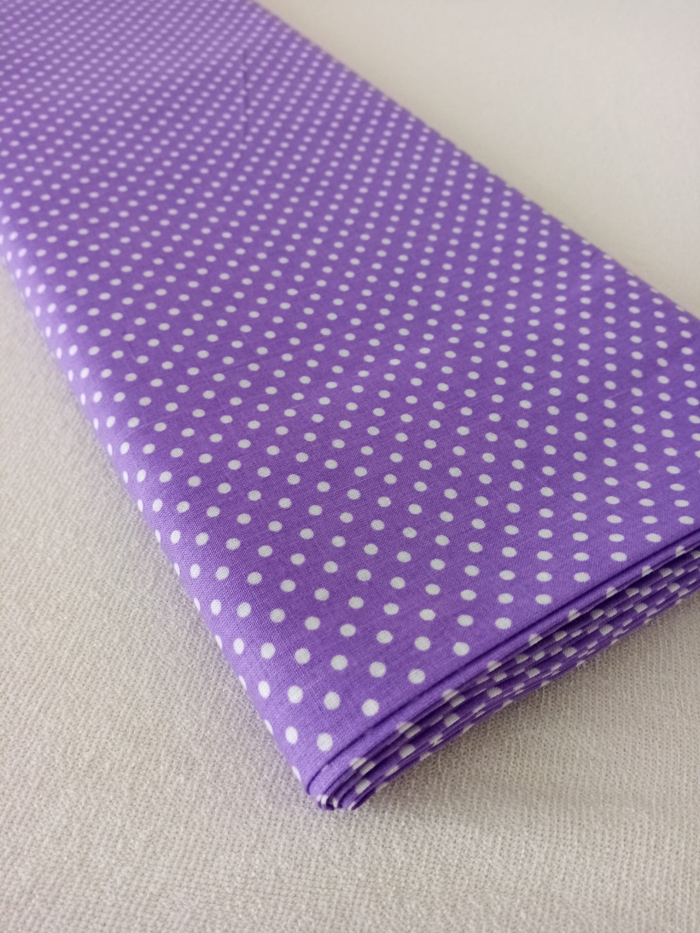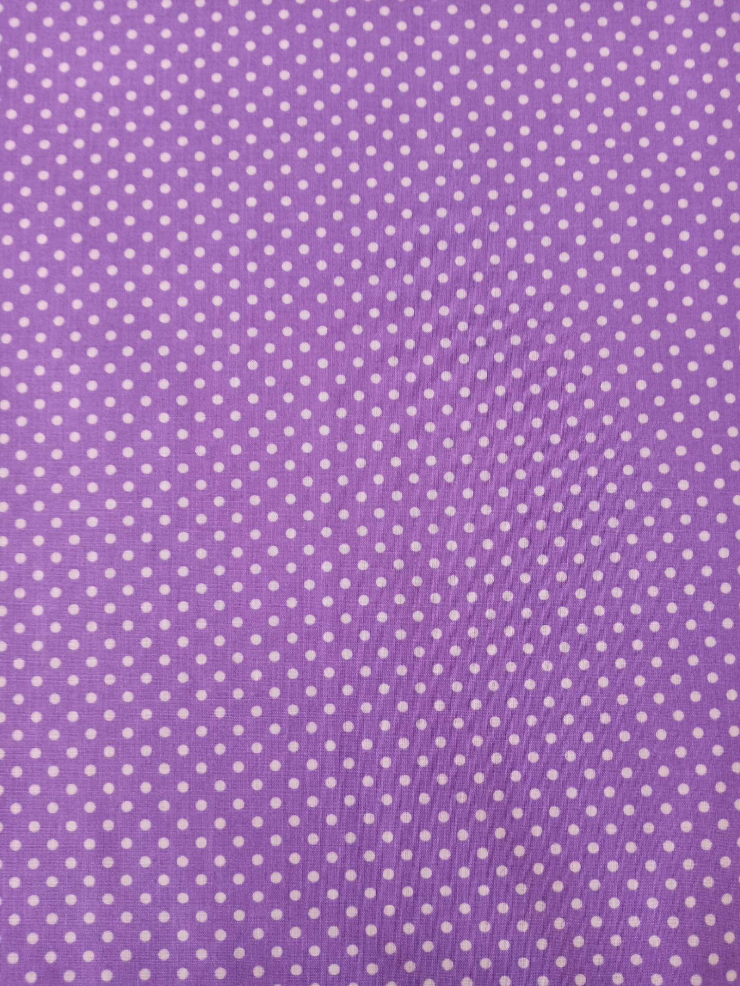Bolinhas Brancas em Fundo Roxo 0,08 € Partilhar O produto encontra-se sem stock. Tecido 50% algodão,50% poliester com bolinhas brancas em fundo roxo. 1.50m de largo. Corte mínimo 20cm