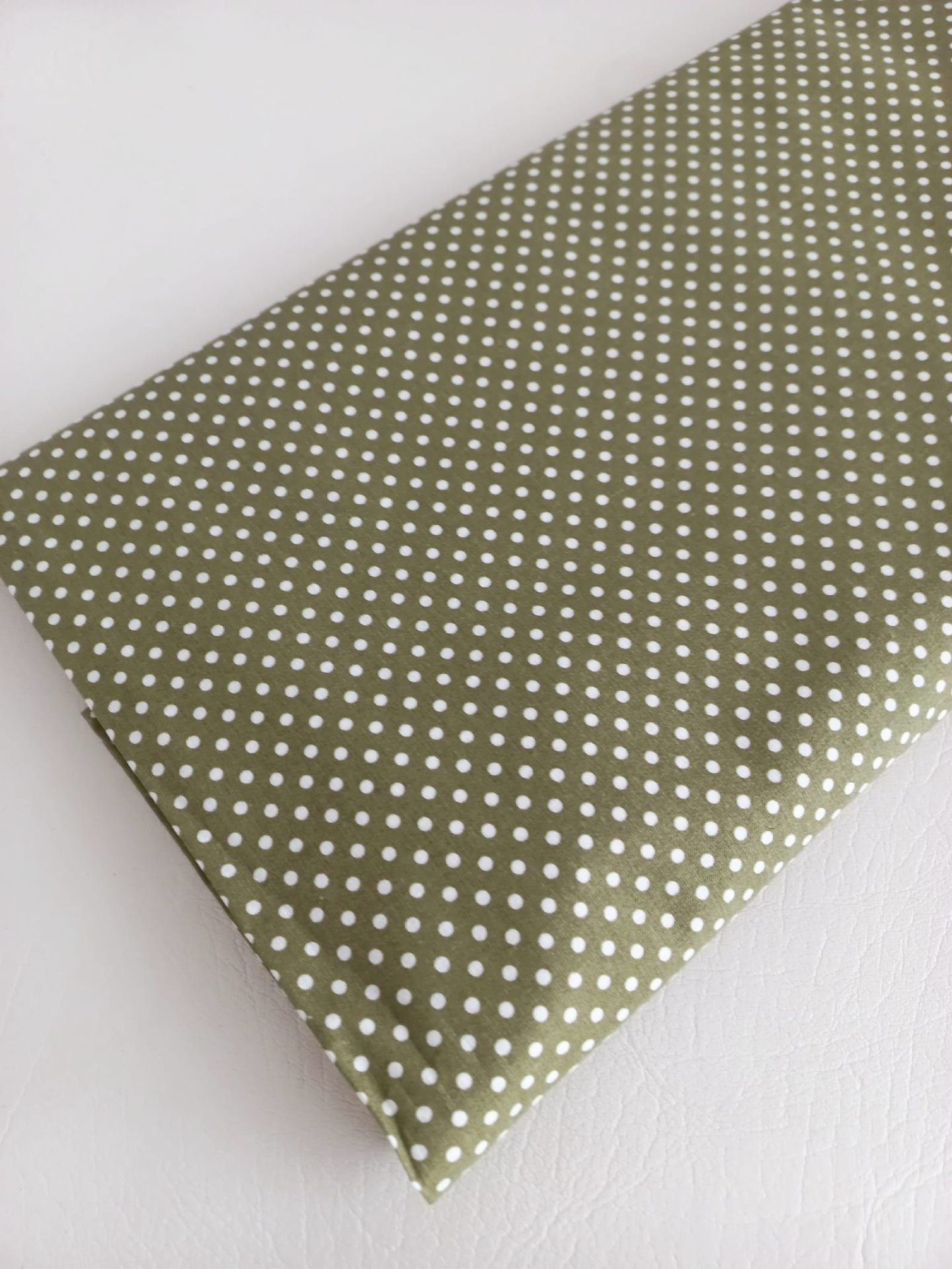 Popeline 100% algodão com bolinhas brancas em fundo verde azeitona.