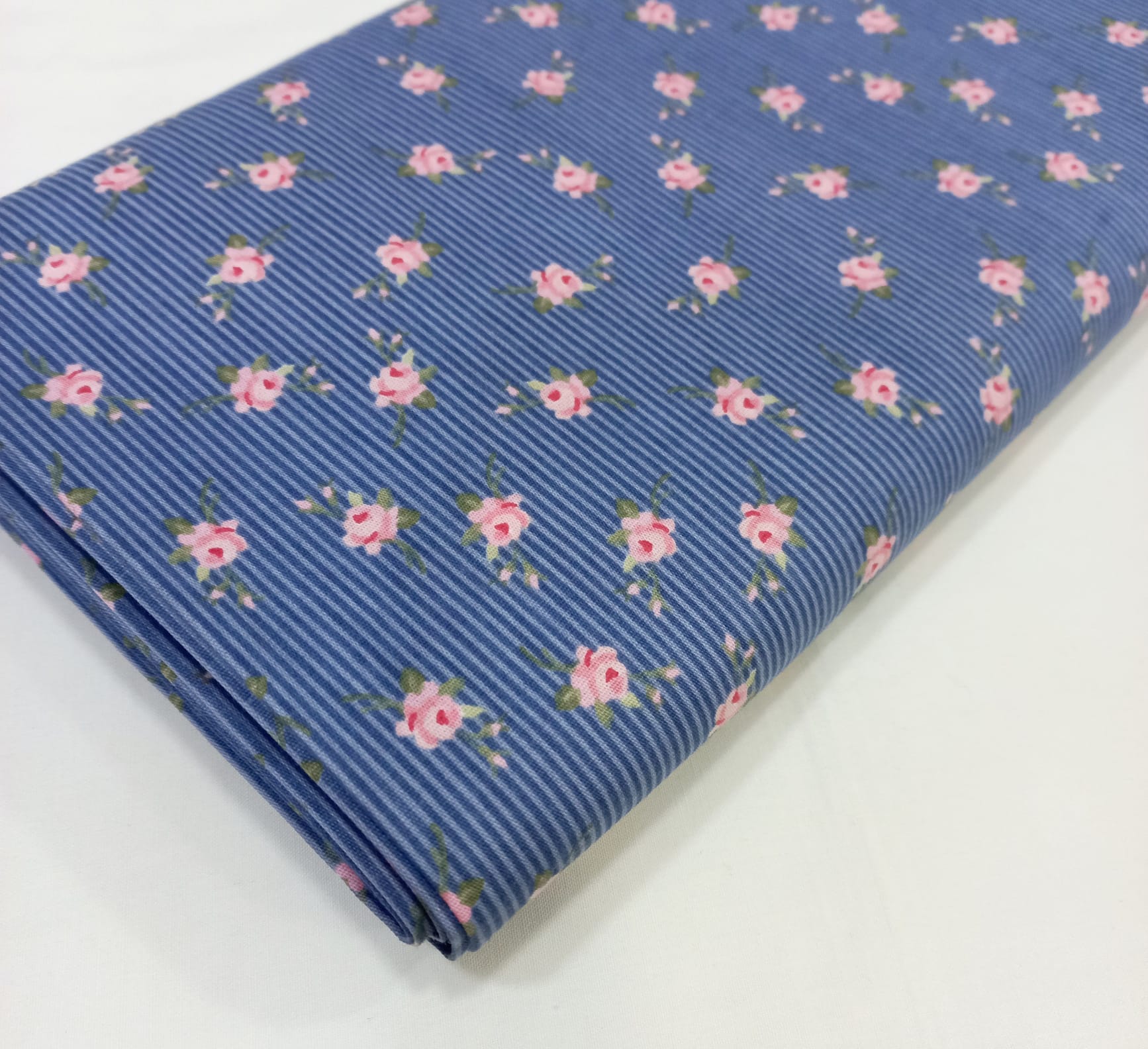 Tricoline Fabricart 100% algodão com rosinhas rosa em fundo listrado azul noite.