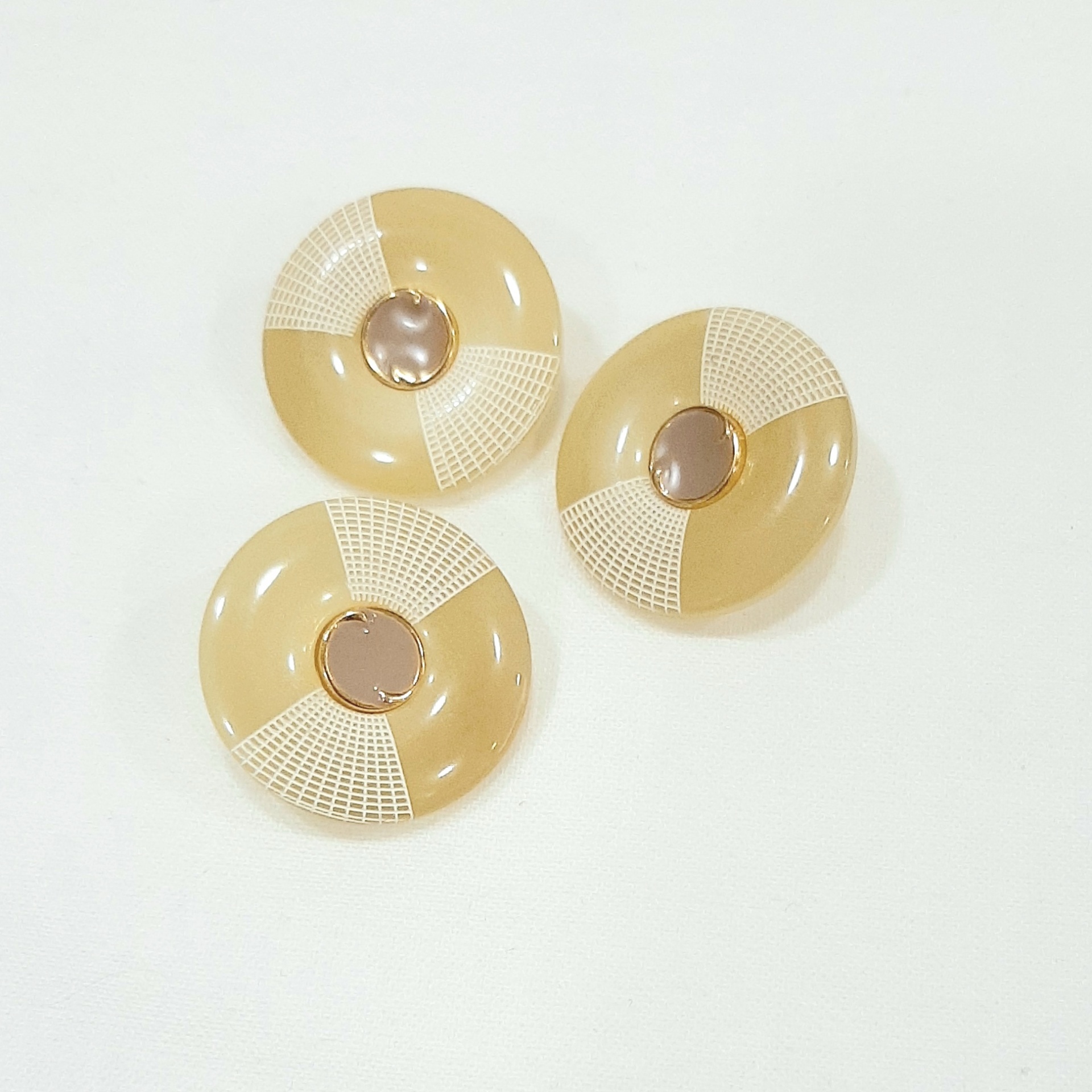 Botão Vintage 74-5205 0,60 € Partilhar Adicionar Contactar 14 unidades em stock Botão Vintage redondo com pé Cor bege com apontamentos em branco e dourado 22mm de diâmetro