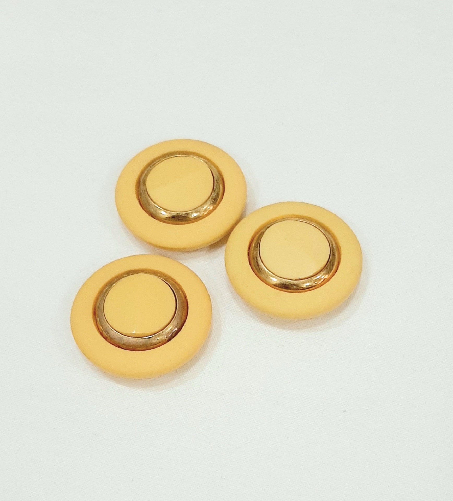 Botão Vintage 743915 1,25 € Partilhar Adicionar Contactar Botão Vintage redondo com pé Cor amarela com apontamentos em dourado 22mm de diâmetro
