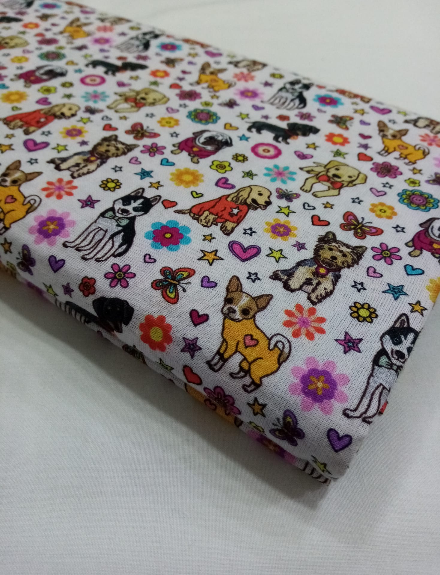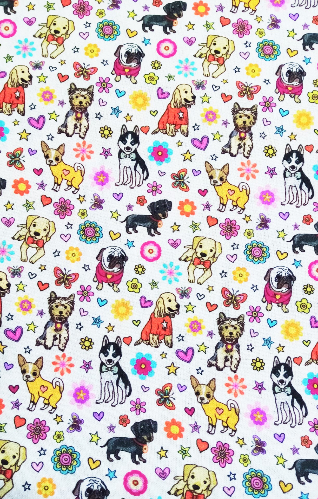 Cães coloridos 0,14 € Partilhar Adicionar Contactar 200 unidades em stock Tecido 100% algodão, com cães coloridos em fundo branco 1.50m de largo Corte mínimo 20cm Tags animais