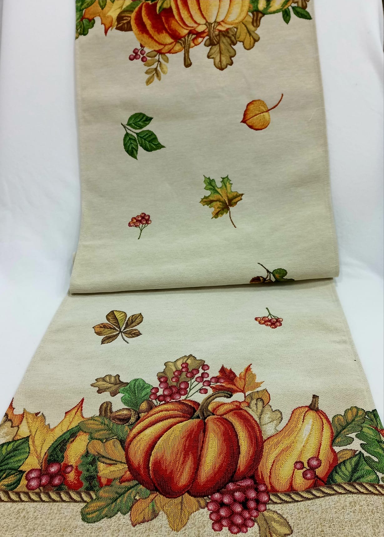 Caminho de mesa Gobelin 55%Poliéster, 45%Algodão, com abóboras e uvas em fundo creme.