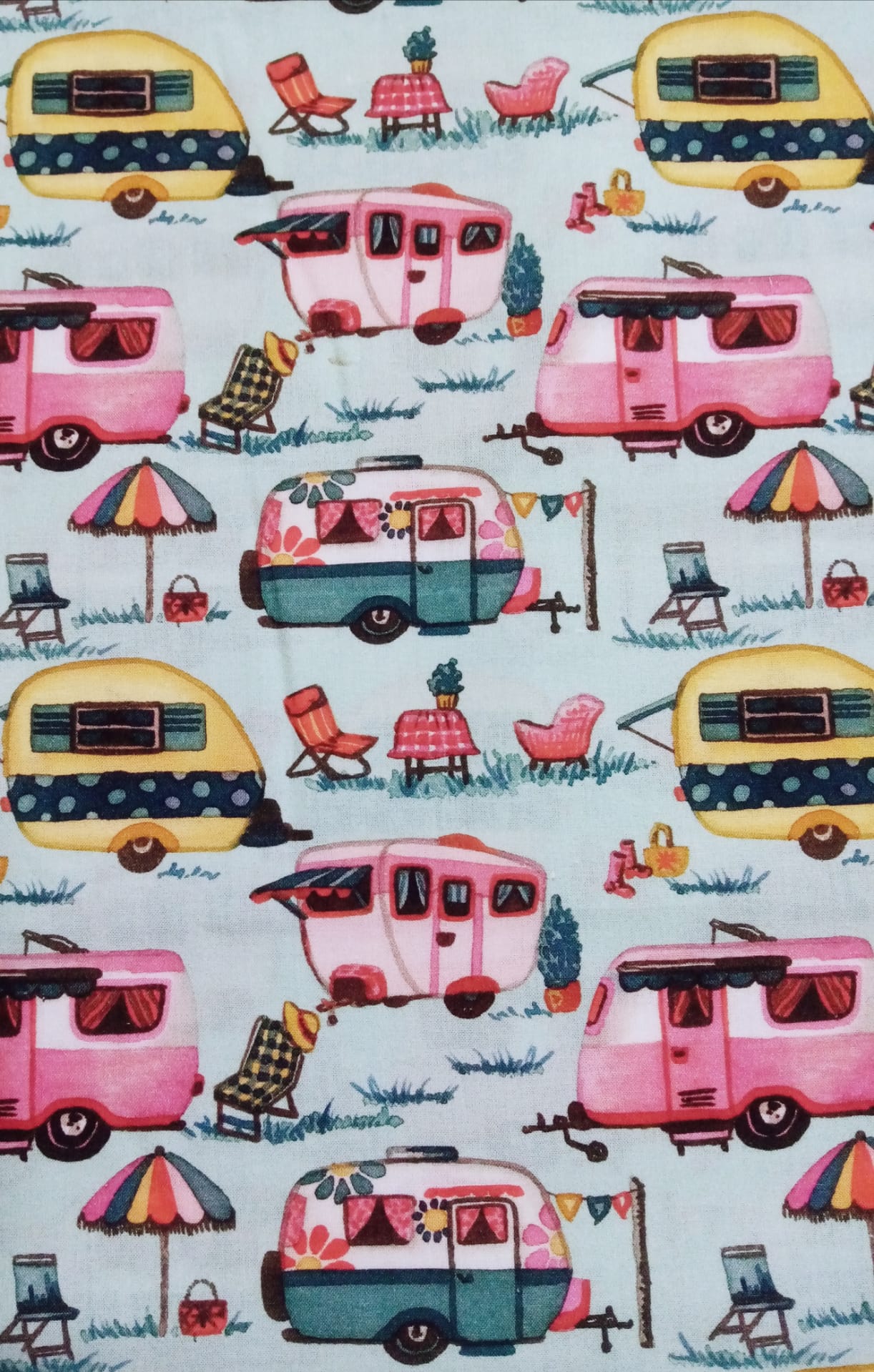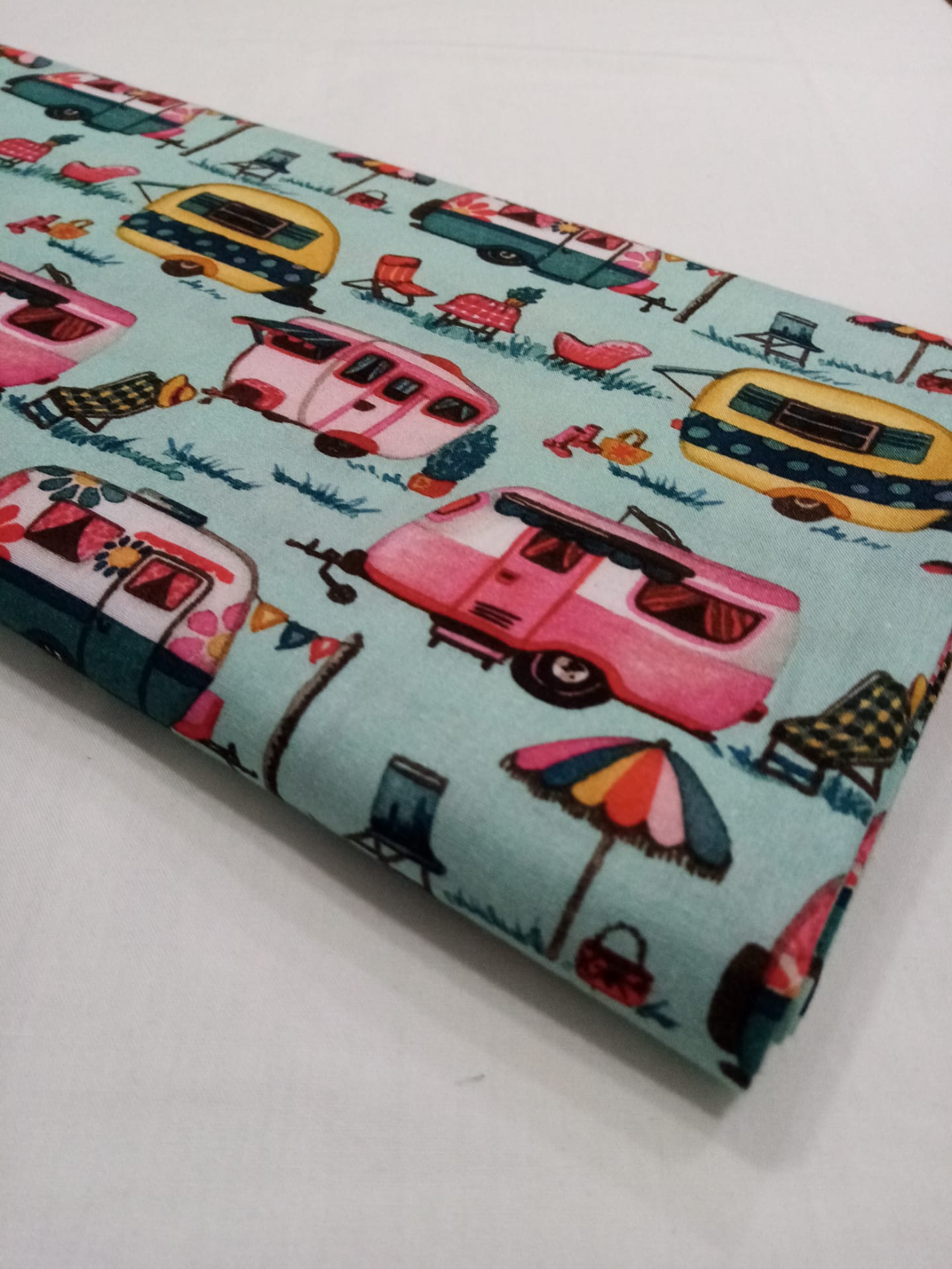 Tecido Stof Fabrics 100% algodão com caravanas em fundo verde água.