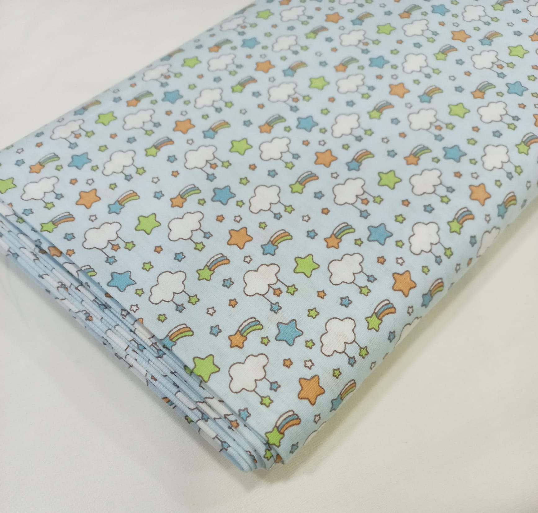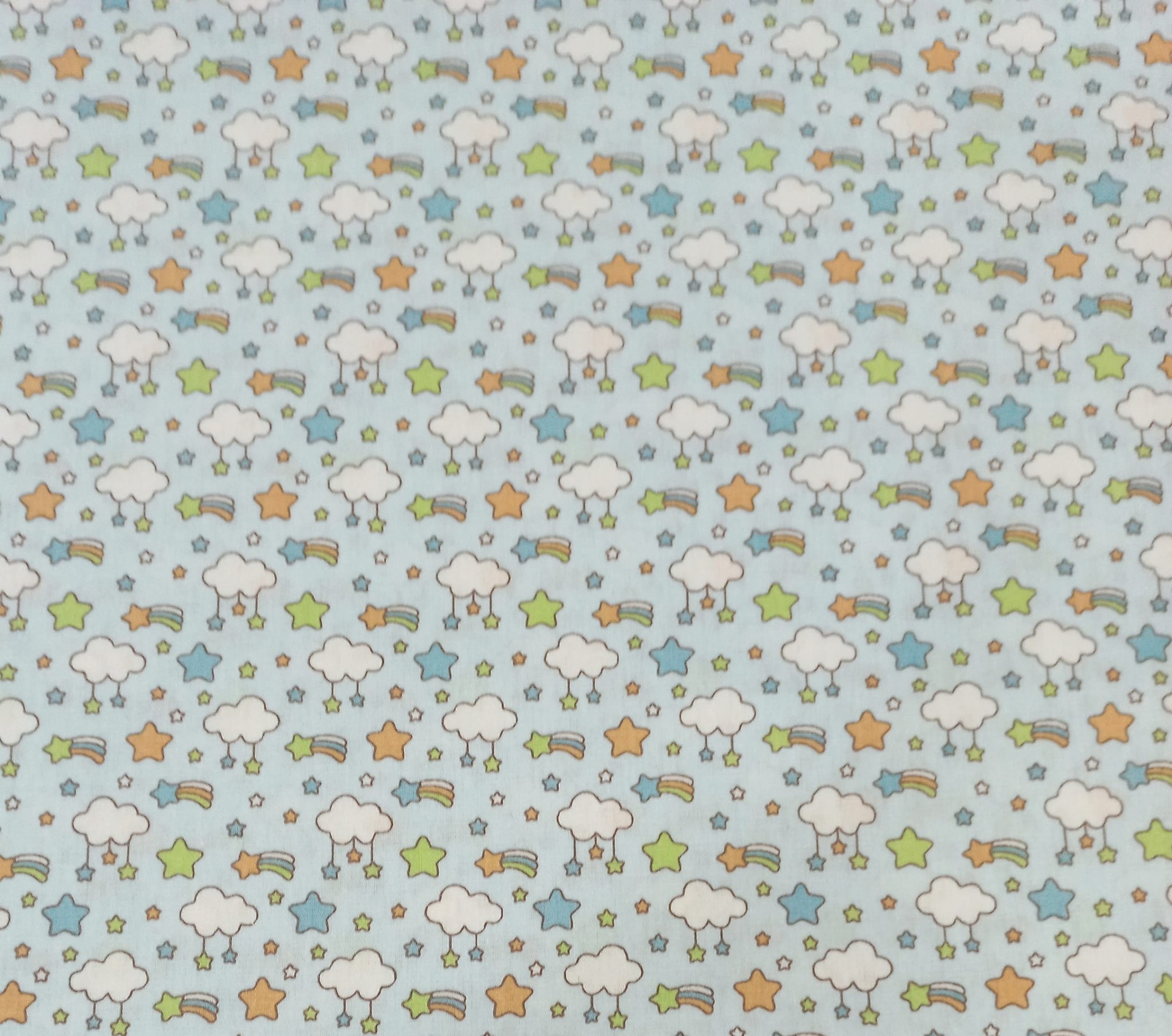 Tricoline Fabricart 100% algodão com nuvens e estrelinhas em fundo azul bebé.