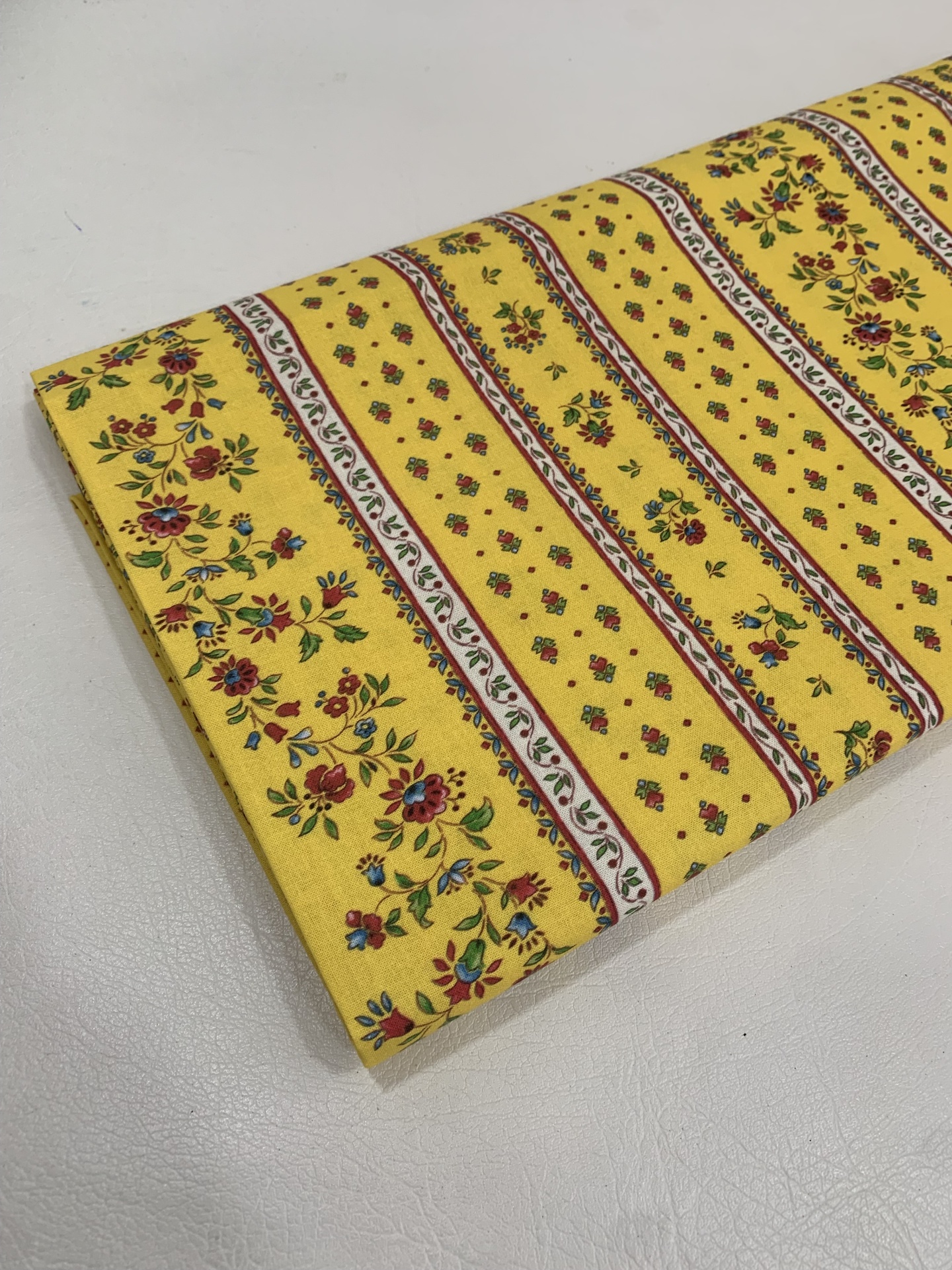 Chita 100% algodão,com riscas bordeaux e flores em fundo amarelo.