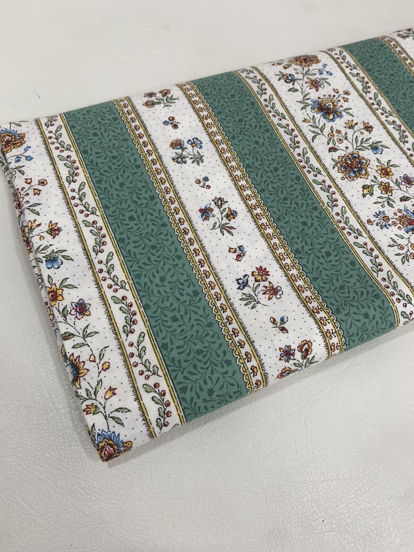 Chita 100% algodão,com riscas verdes e flores amarelas em fundo branco.