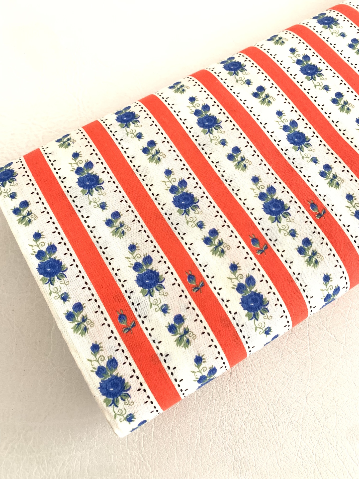 Chita 48% algodão, 52% poliester, com rosas e riscas laranja em fundo pérola.