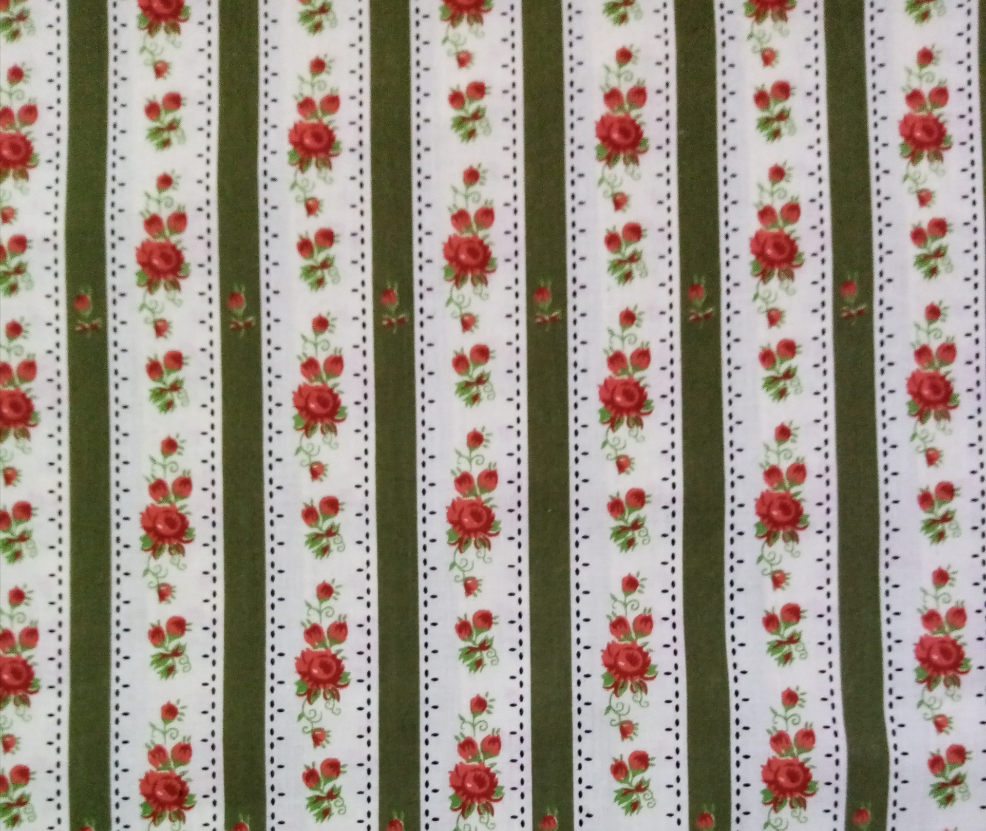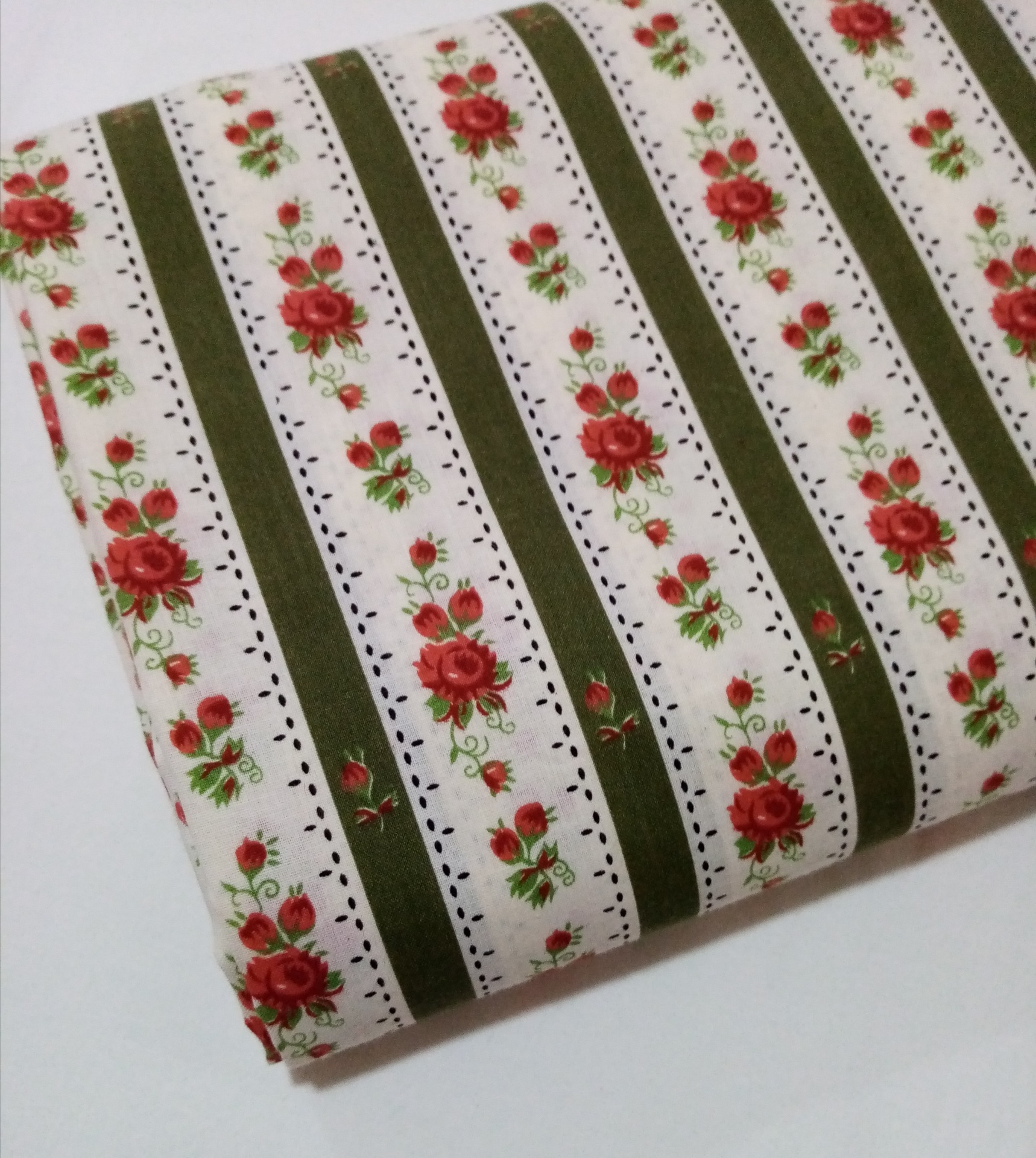 Chita 48% algodão, 52% poliester, com rosas e riscas verde seco em fundo pérola.