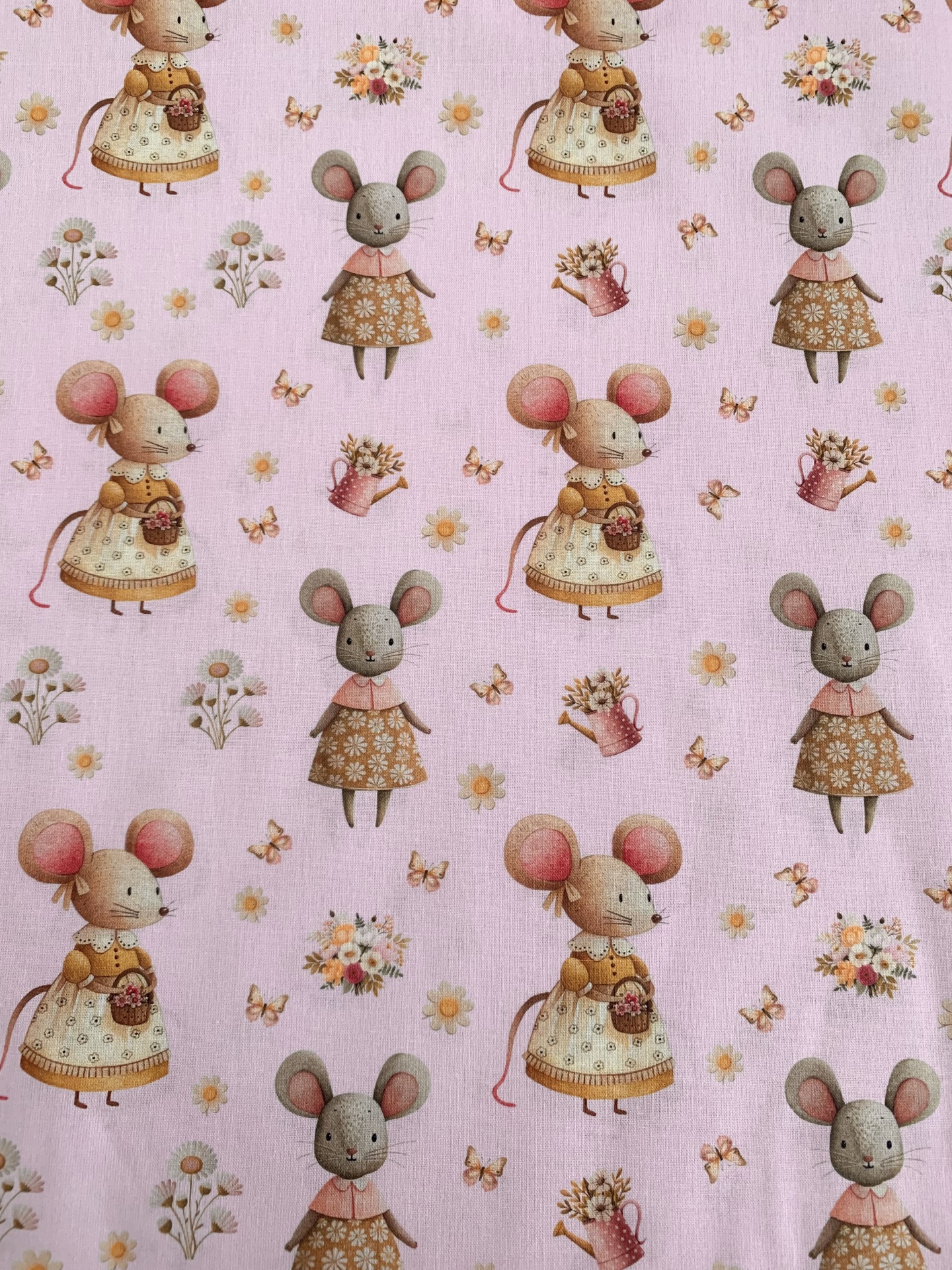 Tricoline 100% algodão com coelhinhas e flores em fundo rosa.