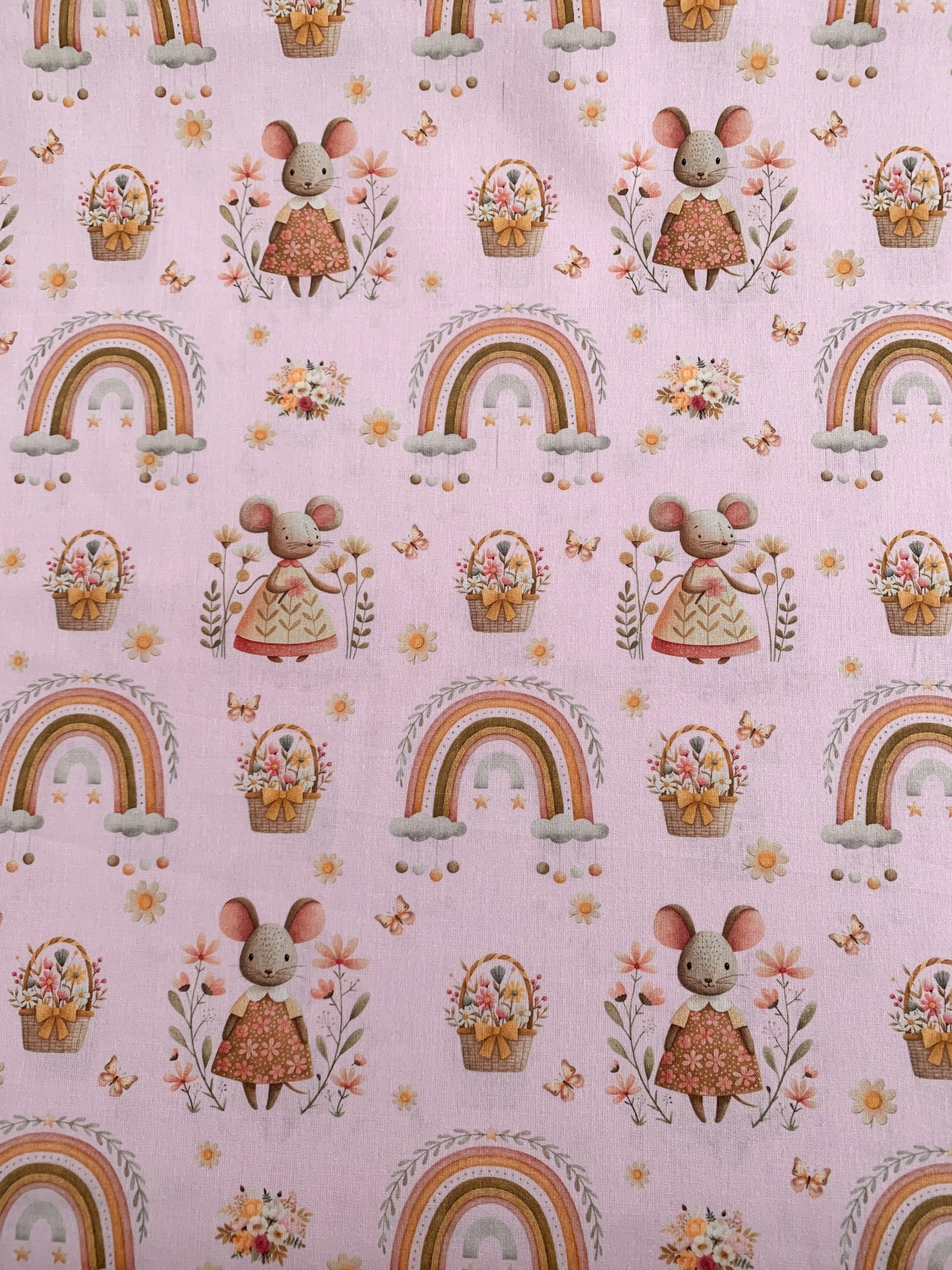 Tricoline 100% algodão com coelhinhas e arco-irís em fundo rosa.