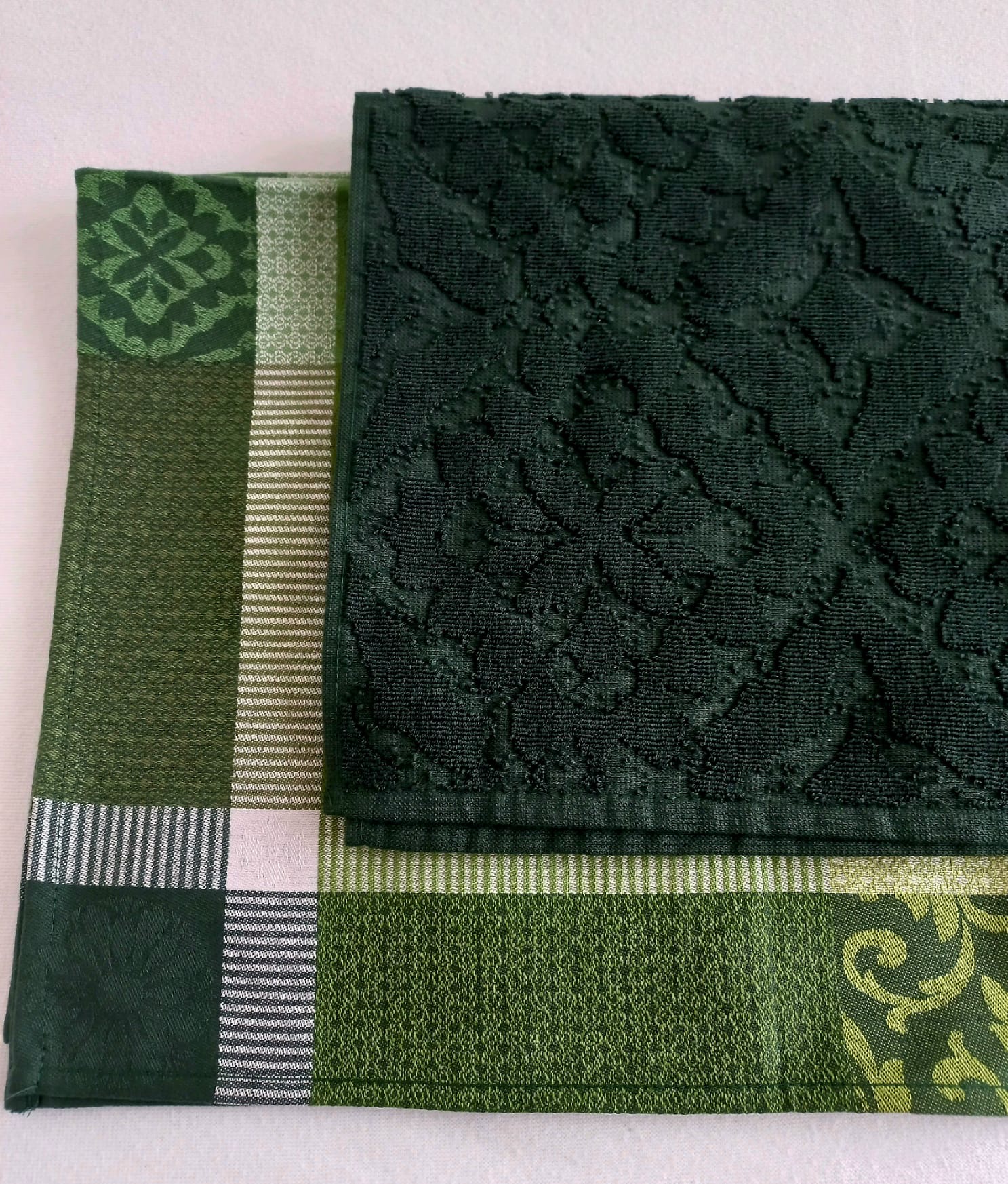Constituído por 1 pano de louça e 1 pano de mãos turco.