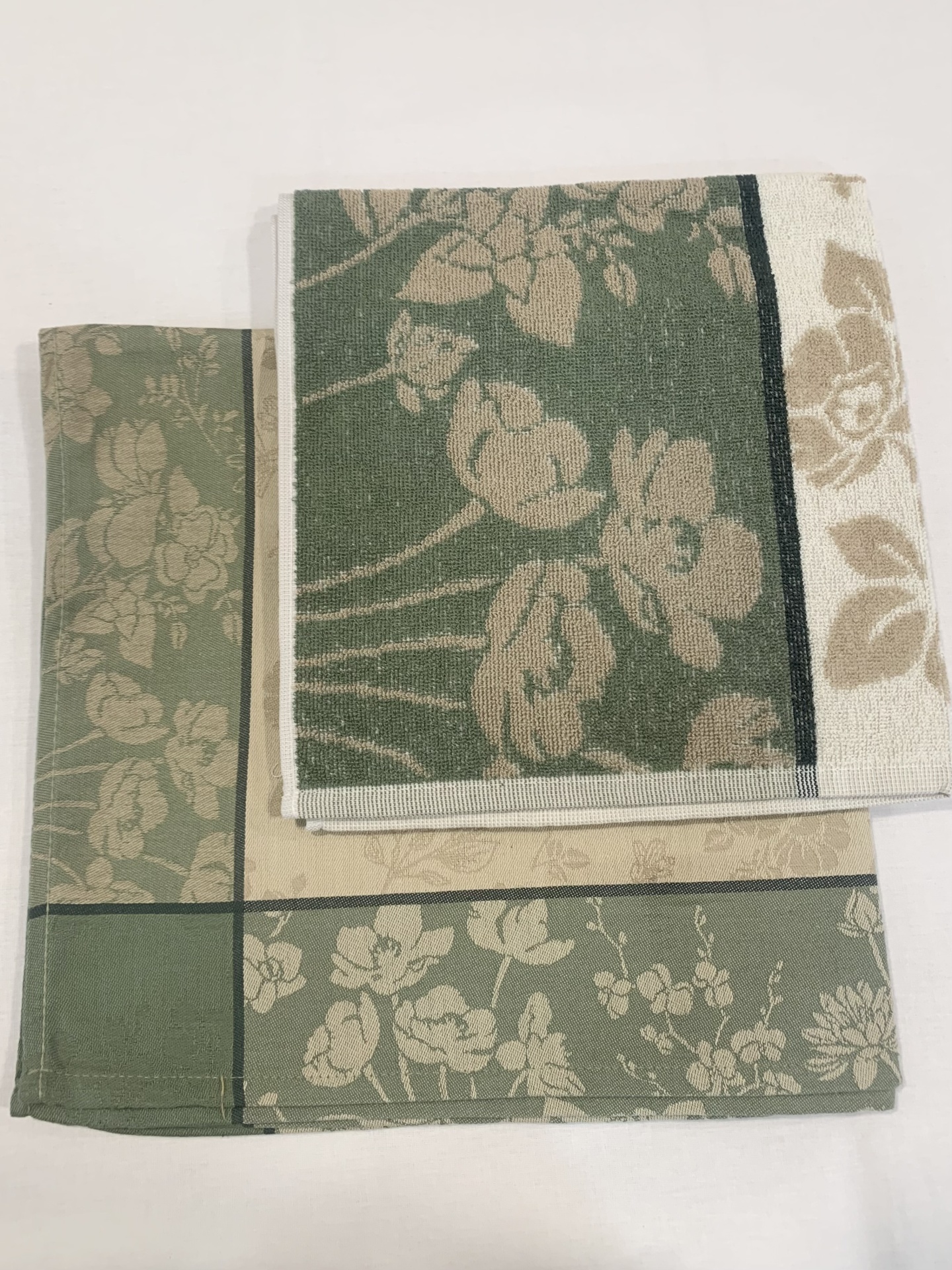 Conjuto de cozinha 100% algodão, em cor verde seco.