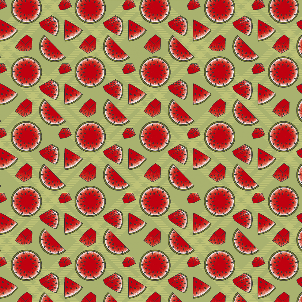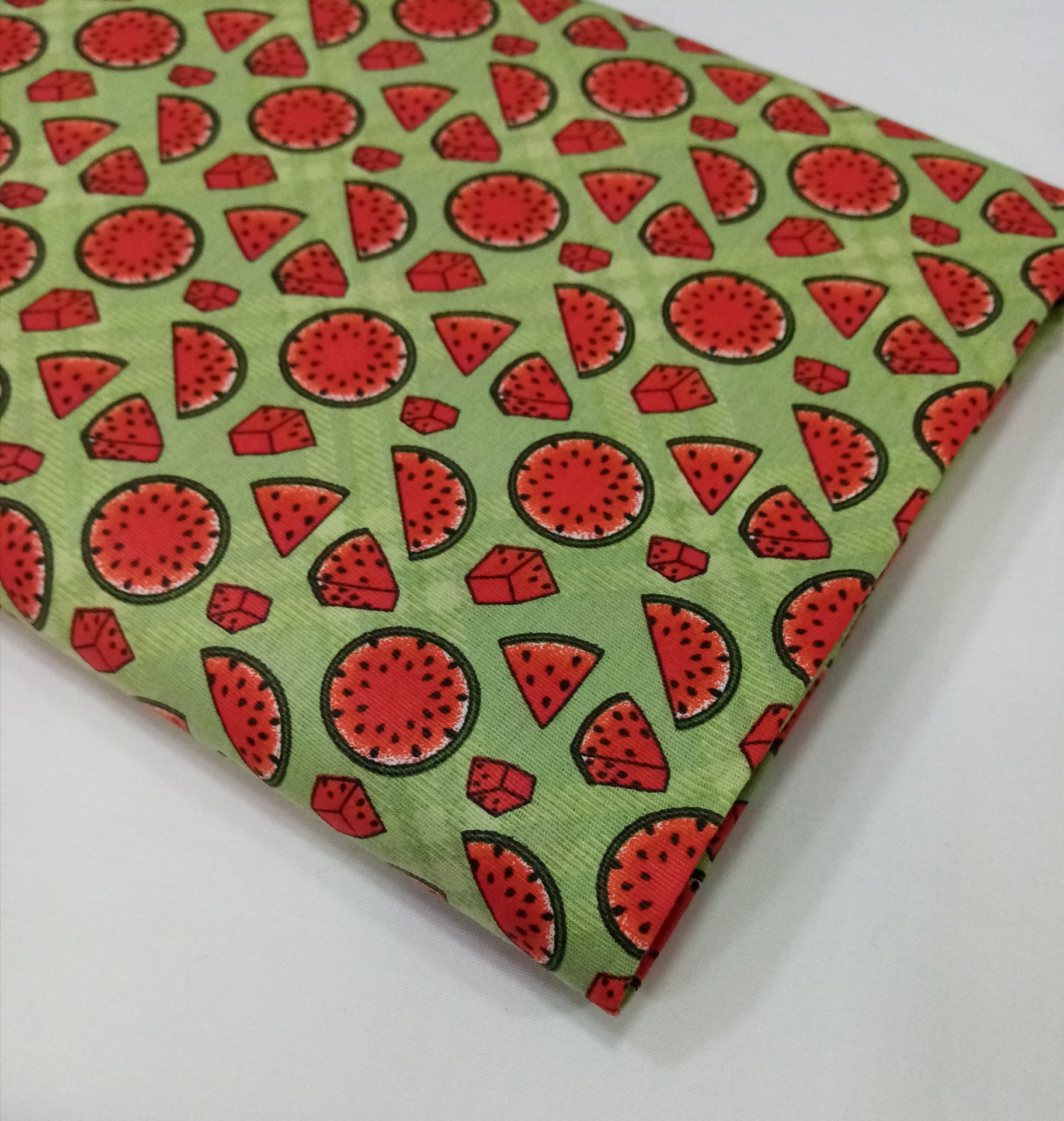 Tricoline Fabricart 100% algodão com cortes de melancia em fundo verde.
