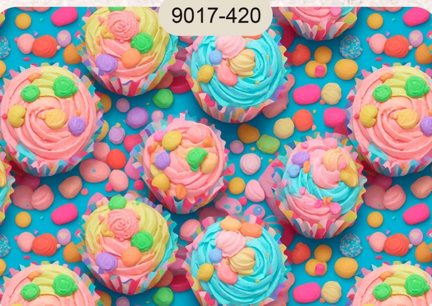 Tecido 100% algodão com cupcakes em 3D, fundo azul turquesa.
