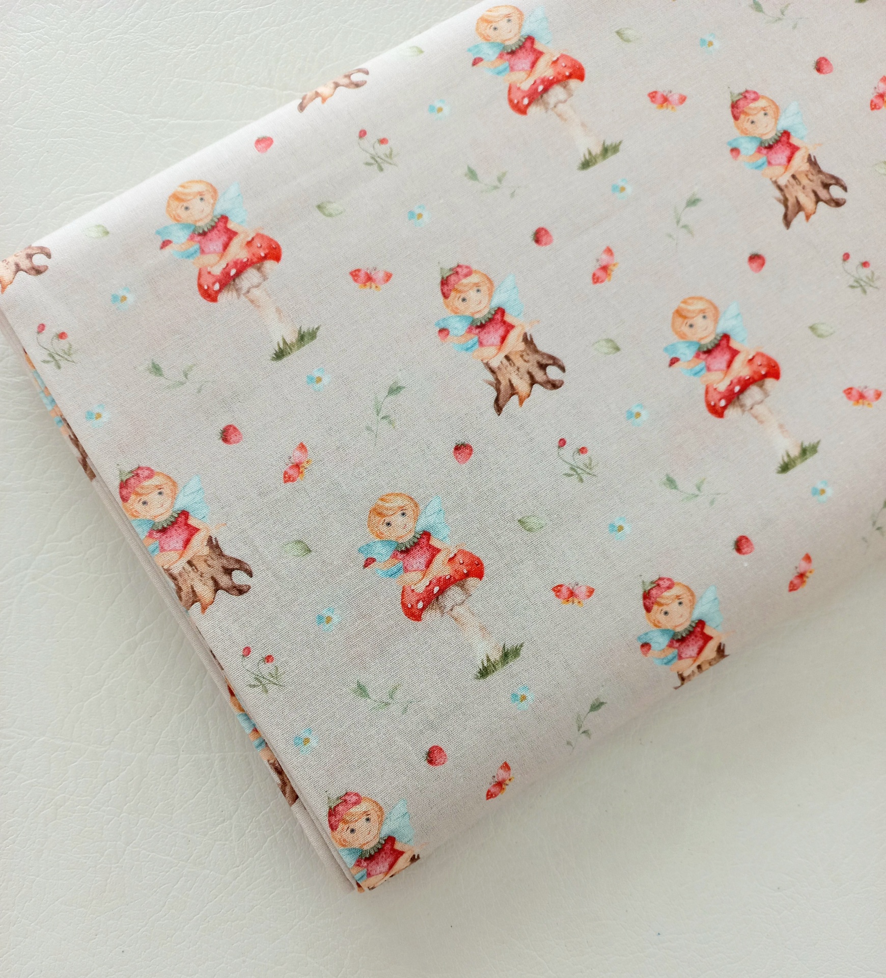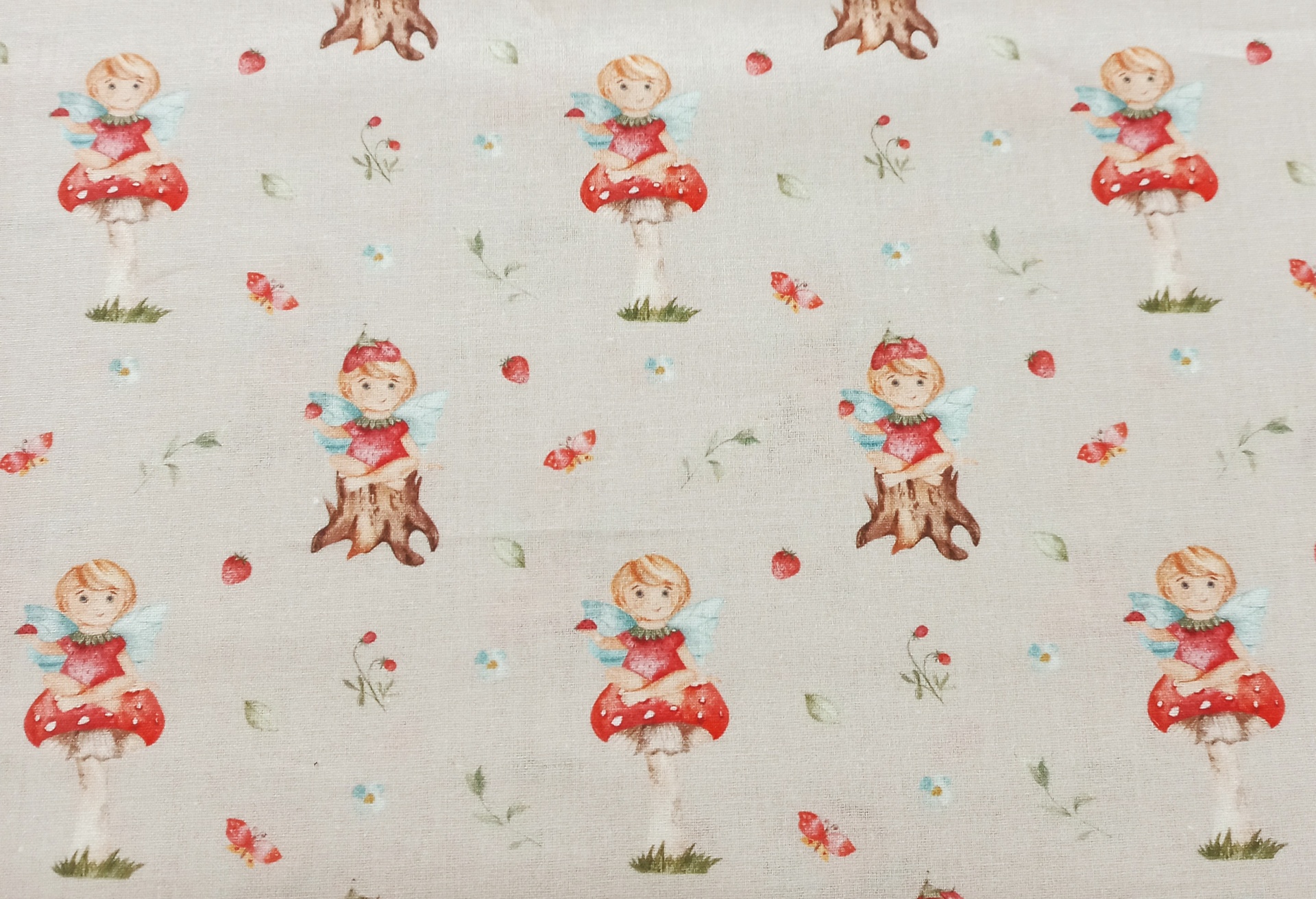 Popeline Poppy Fabrics 100% algodão com duendes e cogumelos em fundo areia.