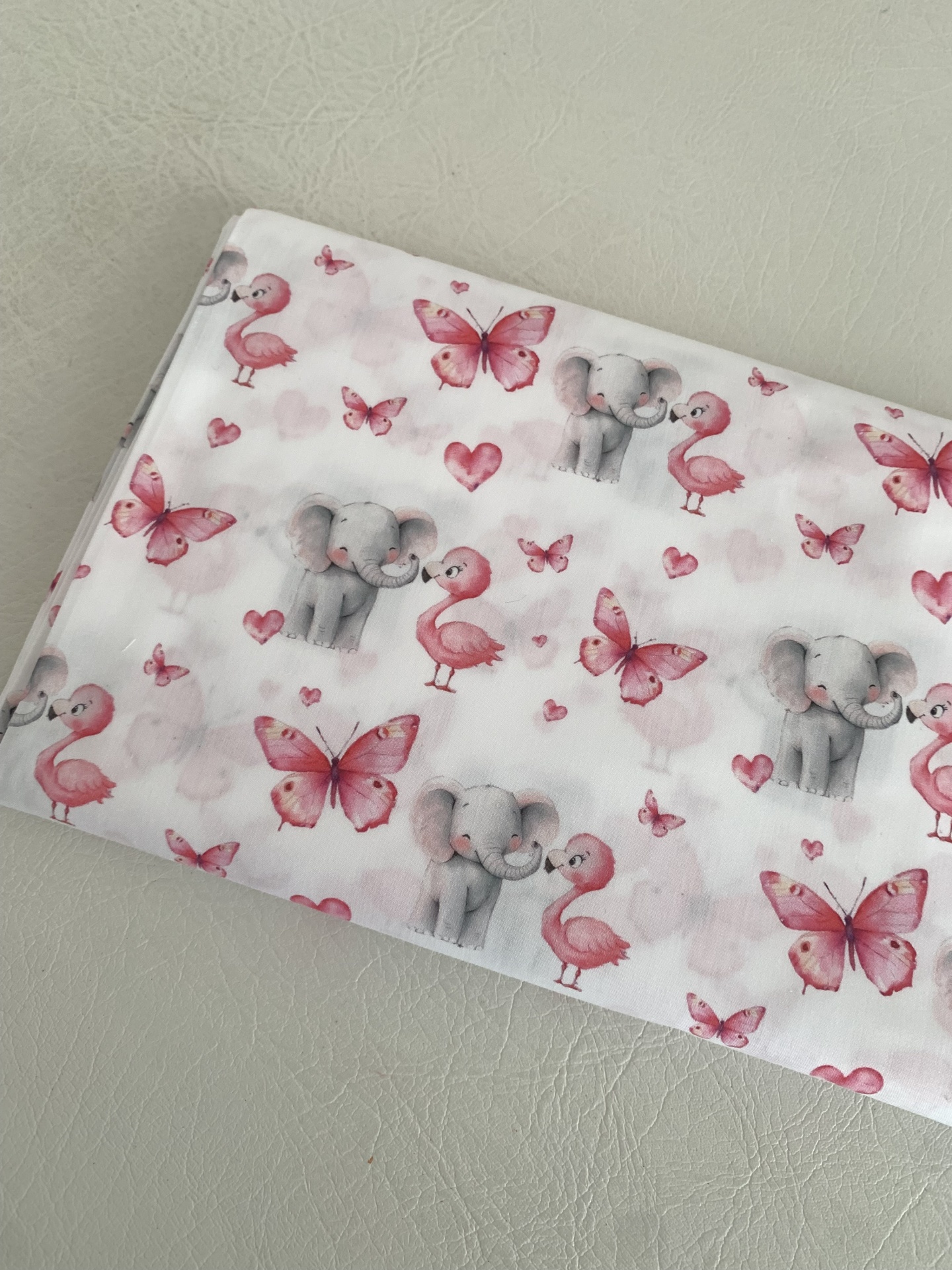 Tecido 100% Algodão , com elefantes e flamingos em fundo branco.