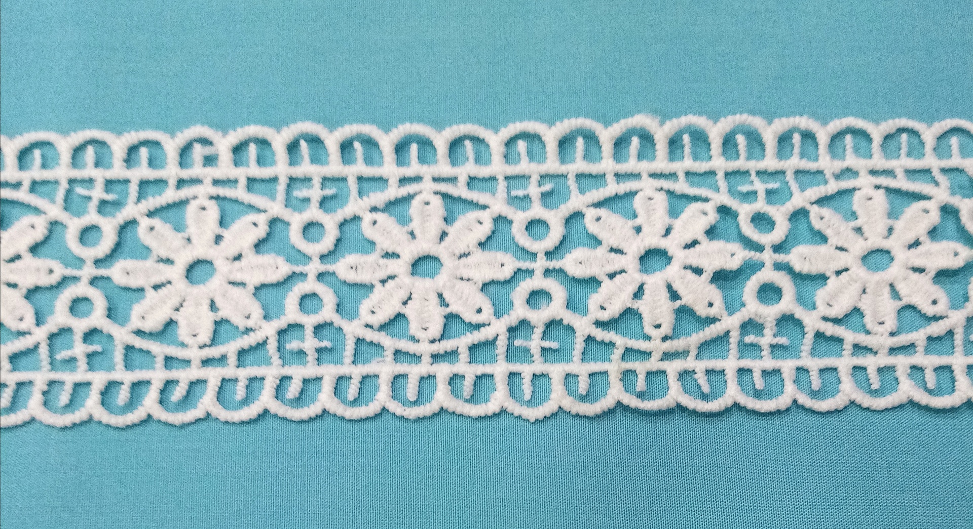Entremeio de Renda Guipure 100% poliéster em branco com flores.