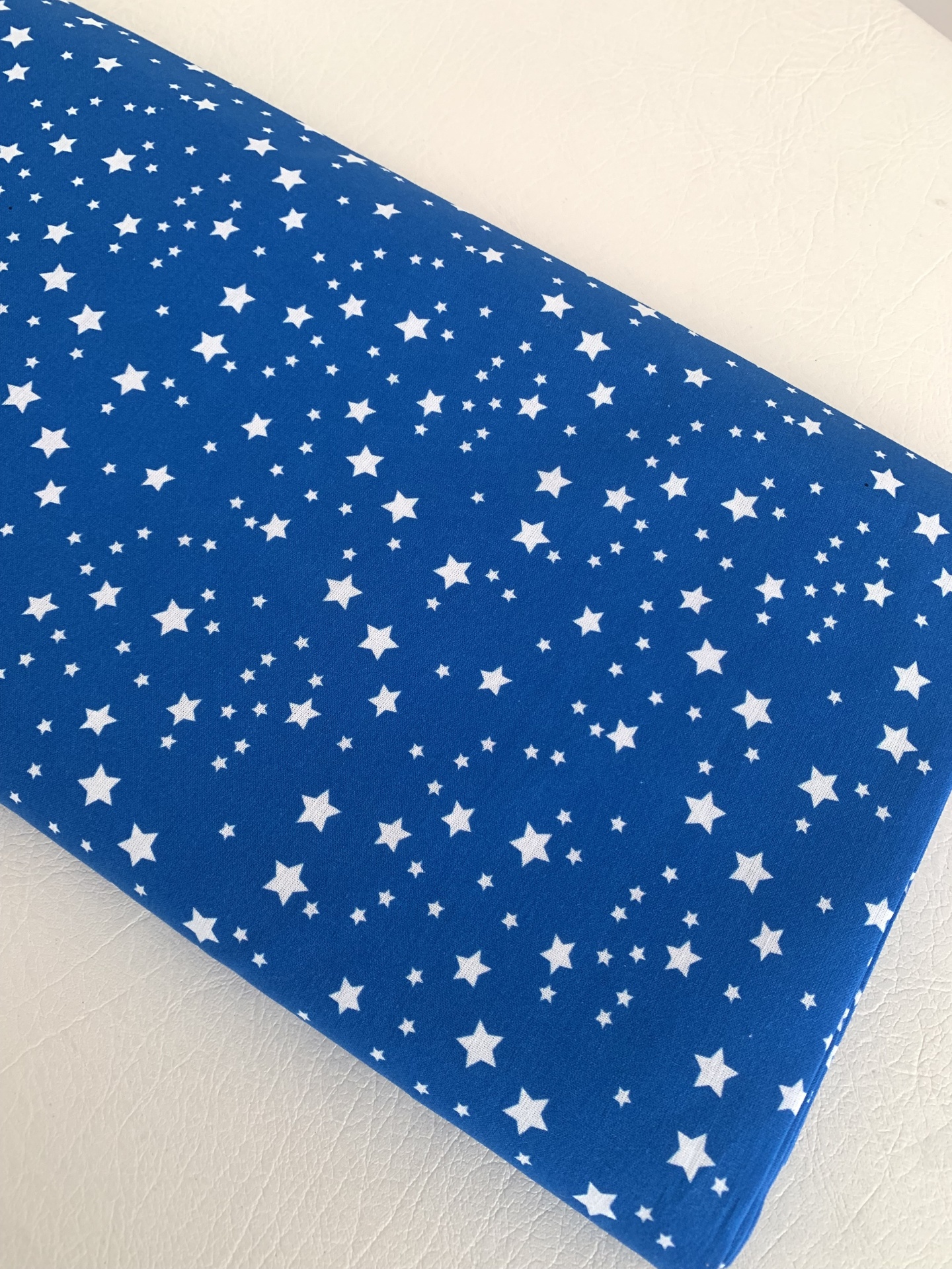 Percal 100% algodão, com estrelas brancas em fundo azul turquesa.