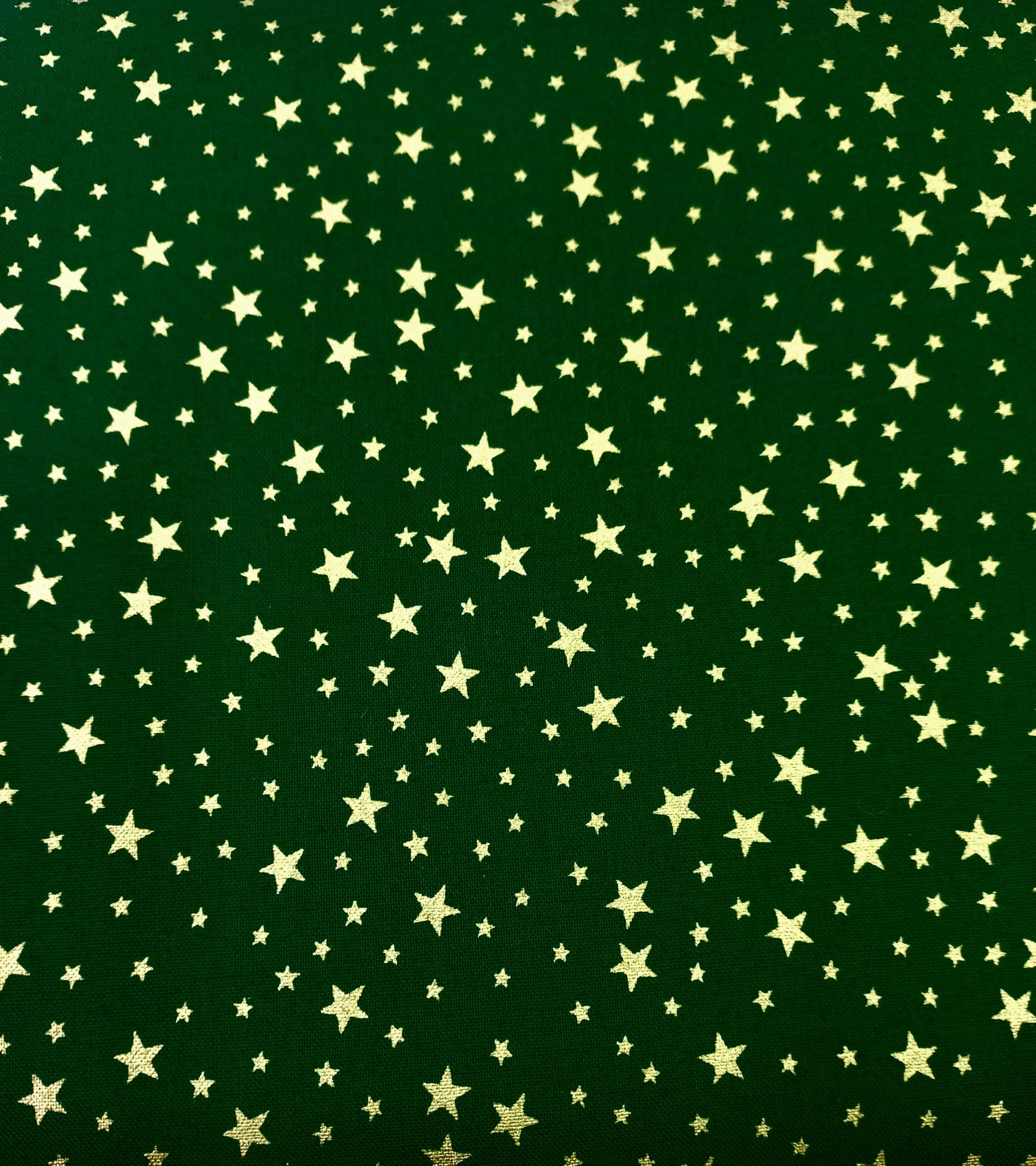 Popeline 100% algodão, com estrelinhas douradas em fundo verde.