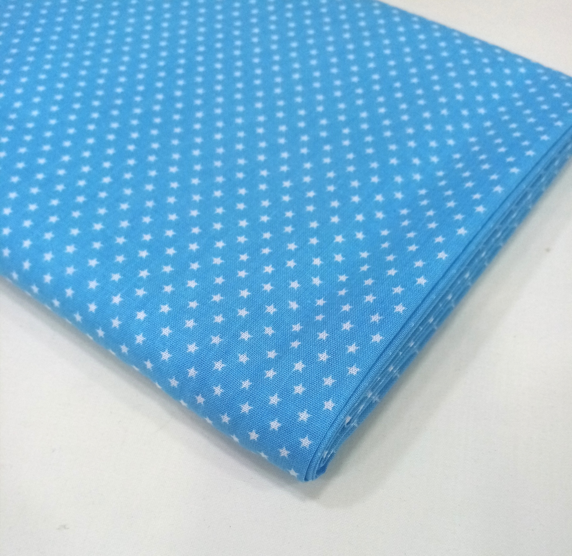 Tecido 50% algodão, 50% poliester com estrelinhas em fundo azul turquesa.