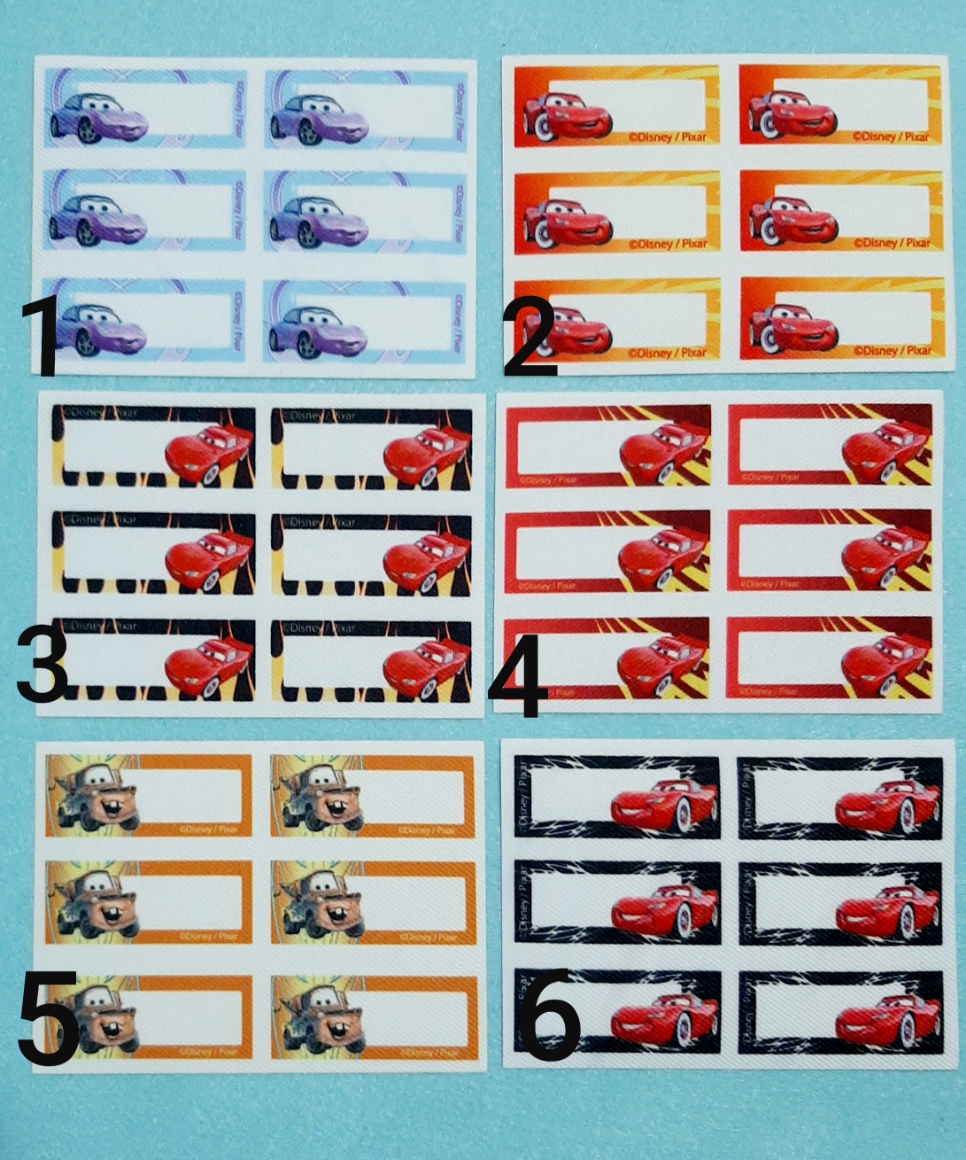 Etiquetas para nome Cars 1,95 € Partilhar Cor 1 - Azul e Lilás 2 - Vermelho e laranja 3 - Preto e amarelo 4 - Vermelho e amarelo 5 - Laranja 6 - Preto Adicionar Contactar 1 unidades em stock Conjunto de etiquetas termoadesivas com motivos do filme Cars 110x80mm