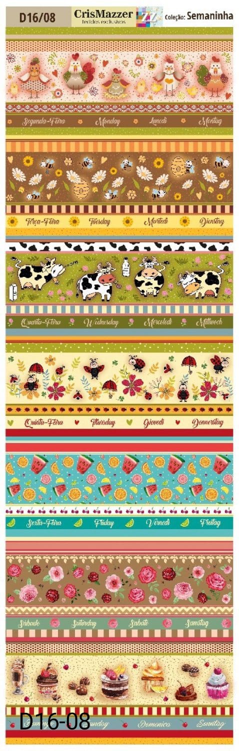 Tricoline 100% algodão com 9 barras com motivos de cozinha, 1 barra verde com pintinhas verde claro, 1 barra amarela com pintinhas castanhas e 7 barras todas elas diferentes com animais.