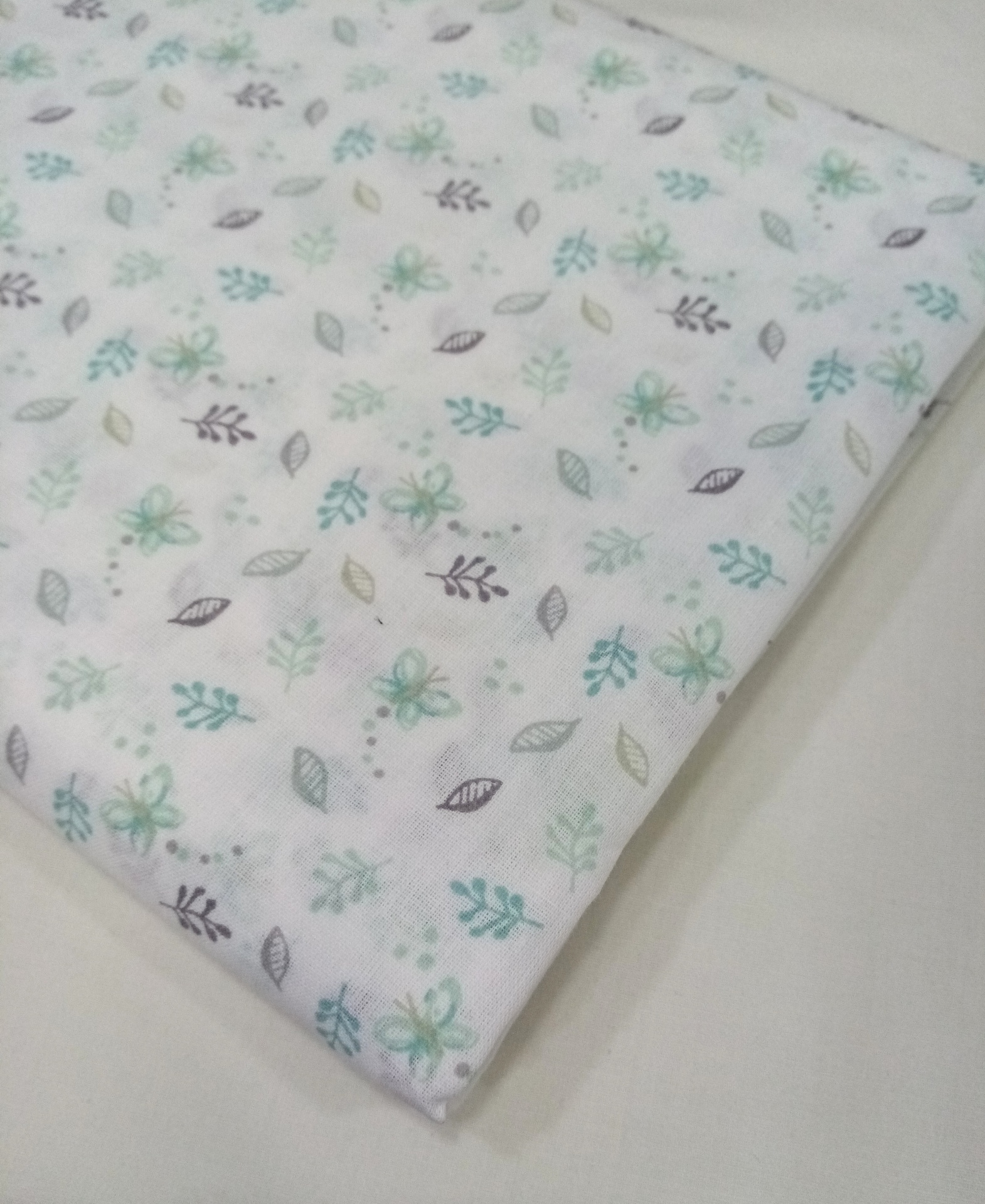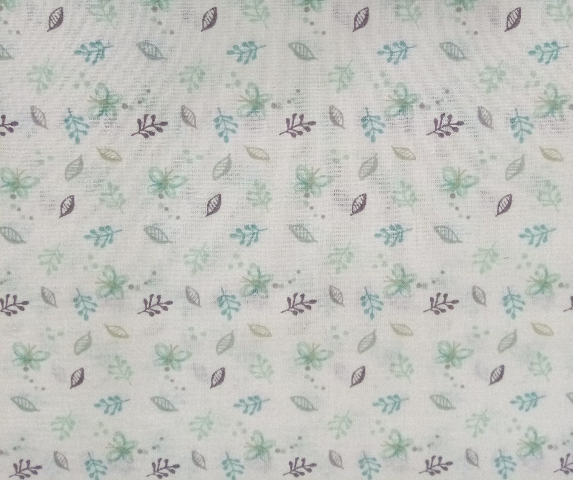 Tecido Stof Fabrics 100% algodão com borboletas e folhas em tons de verdes e cinza em fundo branco.