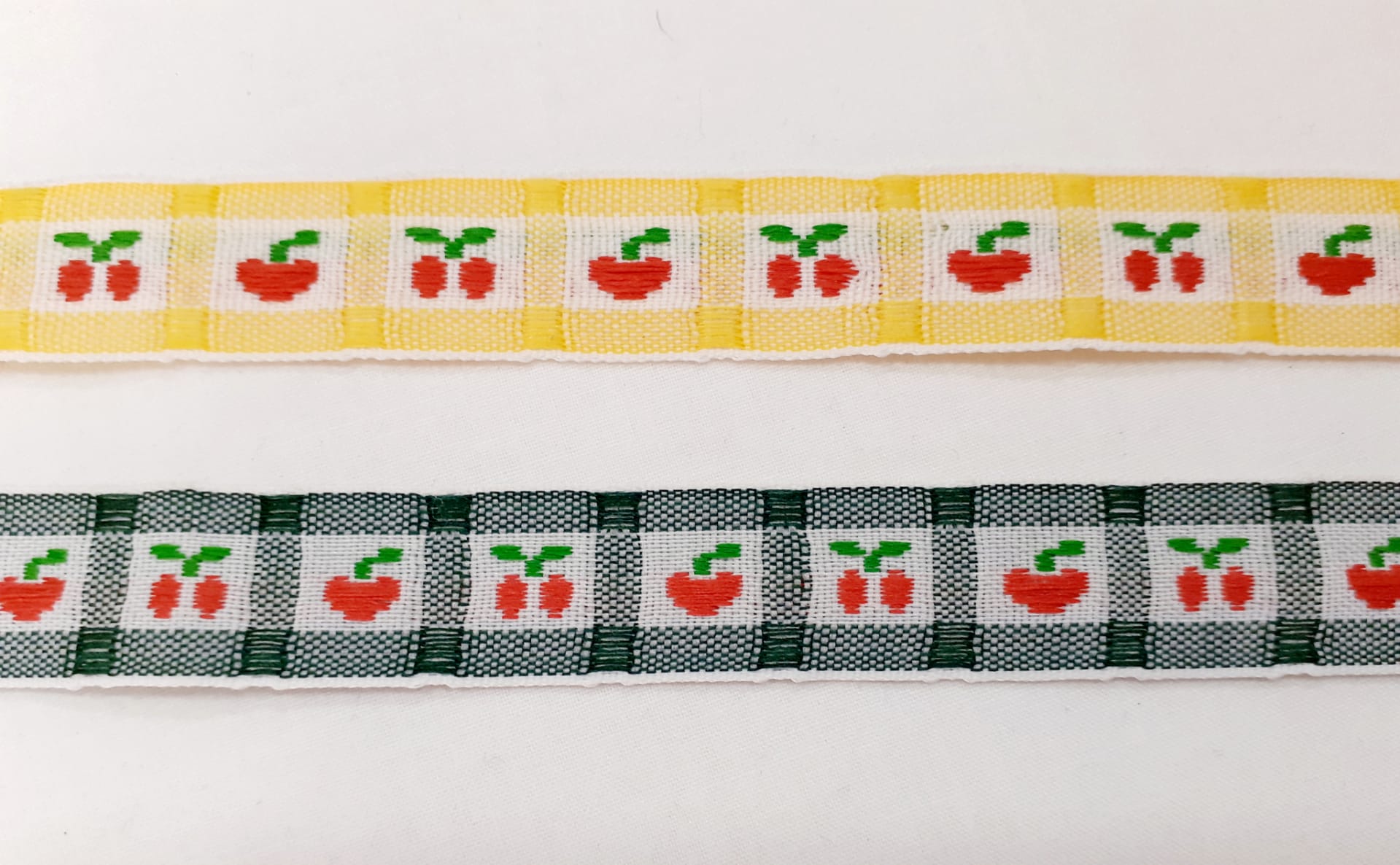 Fita com maçãs 0,00 € Partilhar O produto encontra-se sem stock. Fita 100% poliéster com maçãs com quadrados amarelos ou verdes 20mm Corte mínimo 20cm