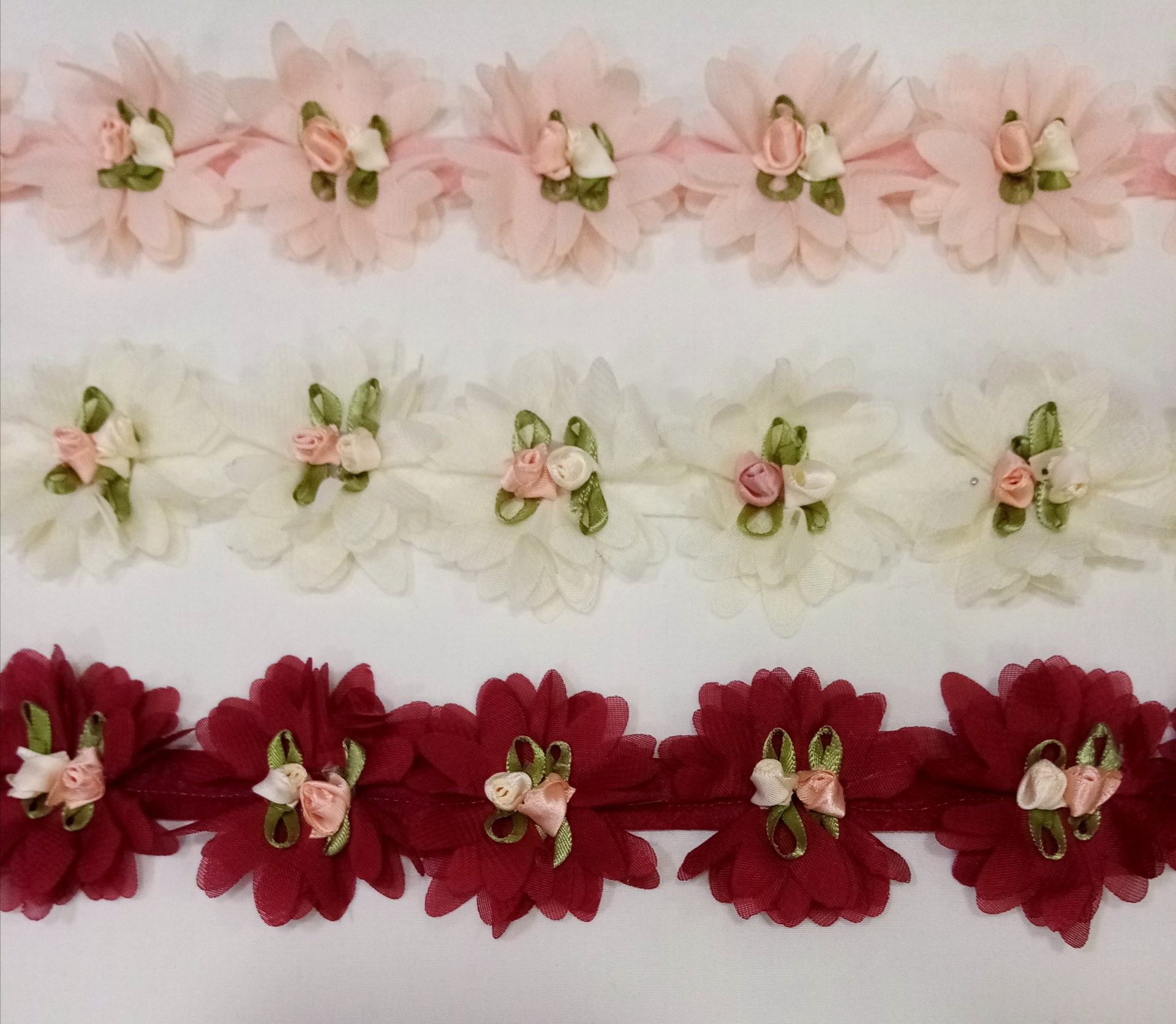 Fita de flores em organza 0,06 € Partilhar Cor Salmão Clarinho Pérola Bordeaux Adicionar Contactar 160 unidades em stock Fita em forma de flores em organza e seda em várias cores. 55mm Ideal para forrar bandoletes , decoração de cintos, sapatos, e ganchos para o cabelo. Corte mínimo 20cm 20cm abrange 4 flores